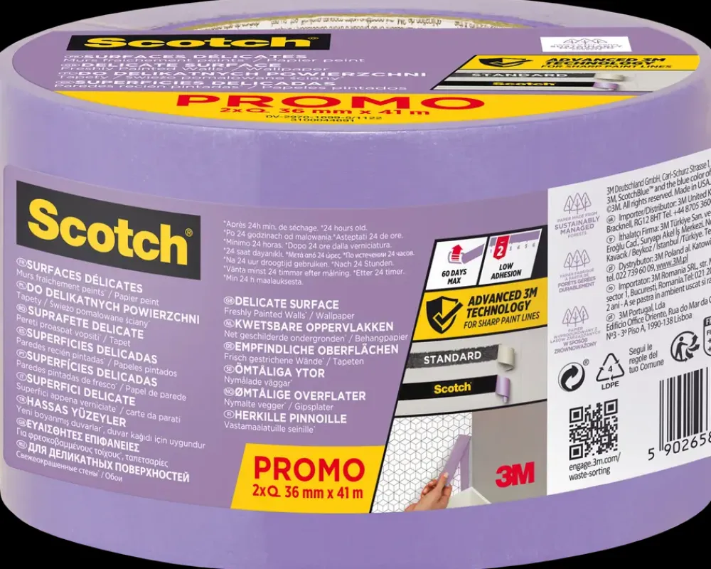 Scotch® afdækningstape til ømtålelige overflader anvendes ved maleropgaver, hvor der er behov for præcise kanter uden at belaste underlaget. Tapen er udviklet til overflader, der kræver en skånsom vedhæftning, og egner sig til indendørs brug.Tapen kan bruges på nymalede vægge, møbler og tapet, hvor lav klæbeevne reducerer risikoen for mærker eller afskalning ved fjernelse. Den er velegnet til afdækning ved maling af vægge, lofter og detaljer, hvor der ønskes rene og kontrollerede malerkanter.Tapen kan fjernes uden at efterlade rester i op til 60 dage ved indendørs brug, forudsat at overfladen er fuldt hærdet. Den er nem at arbejde med og kan rives over i hånden, hvilket giver en effektiv arbejdsproces uden brug af værktøj.Farve: LillaBredde: 36 mmLængde: 2 x 41 m