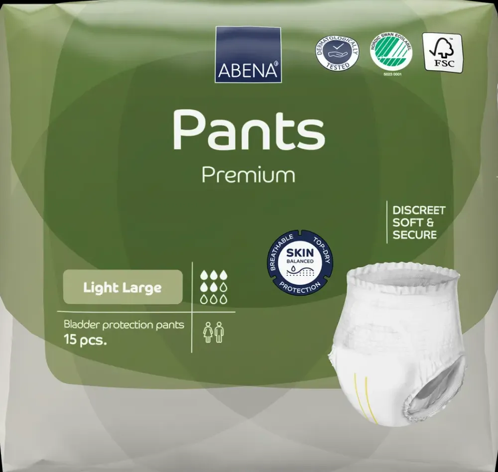 ABENA Pants Light er vores førsteklasses serie af engangsbuksebleer til let inkontinens, udviklet og fuldt tilpasset slutbrugerens behov. Produktet kan anvendes som normalt undertøj og er lavet af åndbart og superblødt materiale for optimal komfort. Det store antal lycratråde i linningen sørger for en sikker og behagelig pasform til den aktive brugere. Den effektive kerne med Top-Dry teknologi giver hurtig absorption og tør overflade, selv efter gentagne vandladninger, og sikrer optimal hudbalance og øger komforten. 360 graders lækagebeskyttelse i form af barrierer og elastikker. Disse funktionaliteter hjælper med at beskytte huden og opretholde en naturlig hudbalance. Odor-systemet minimerer risikoen for ubehagelige lugtgener. Den diskrete vådindikatoren hjælper brugeren og plejepersonalet med at finde produktet med det rette absorptionsniveau. De dermatologisk testede produkter bærer Svanemærket.Materiale: Åndbar bagfolie, ECF fluff, elastan, nonwoven, PE, PP, resin, SAP.Hoftevidde: 100-140 cmLængde/dybde: 92 cmBredde: 78 cmAbsorptionsevne: 900 ml