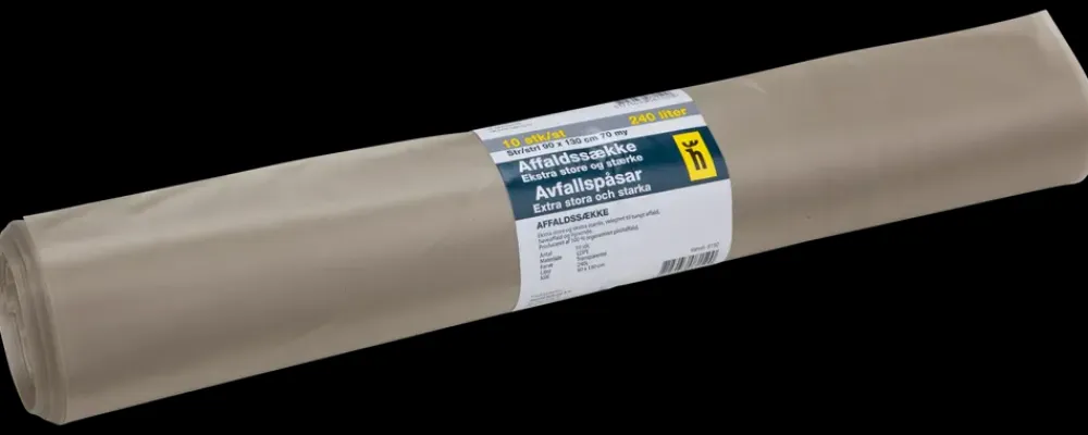 Rulle med 10 stk. ekstra kraftige og ekstra store affaldssække, i klar plast.Anvendes til: Småt brandbart, tungt haveaffald og husholdningsaffald.