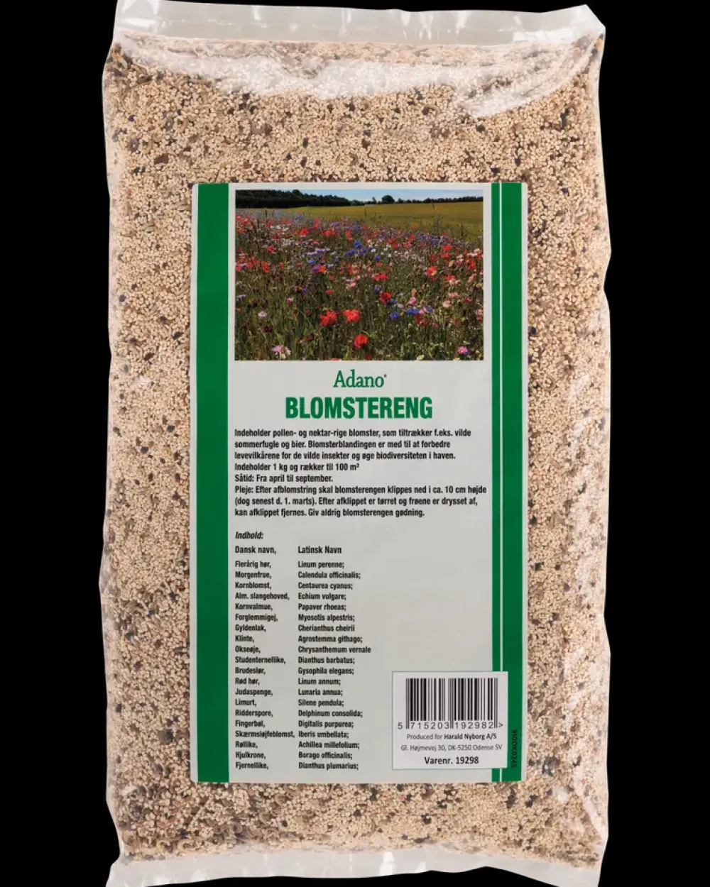 Adano blomstreng indeholder pollen- og nektarrige blomster, som tiltrækker f.eks. vilde sommerfugle og bier. Blomsterblandingen er med til at forbedre levevilkårene for de vilde insekter og øge biodiversiteten i haven.Såtid: Fra april til september.Pleje: Efter afblomstring skal blomsterengen klippes ned i ca. 10 cm højde. Giv aldrig gødning.Rækker til 100 m².
