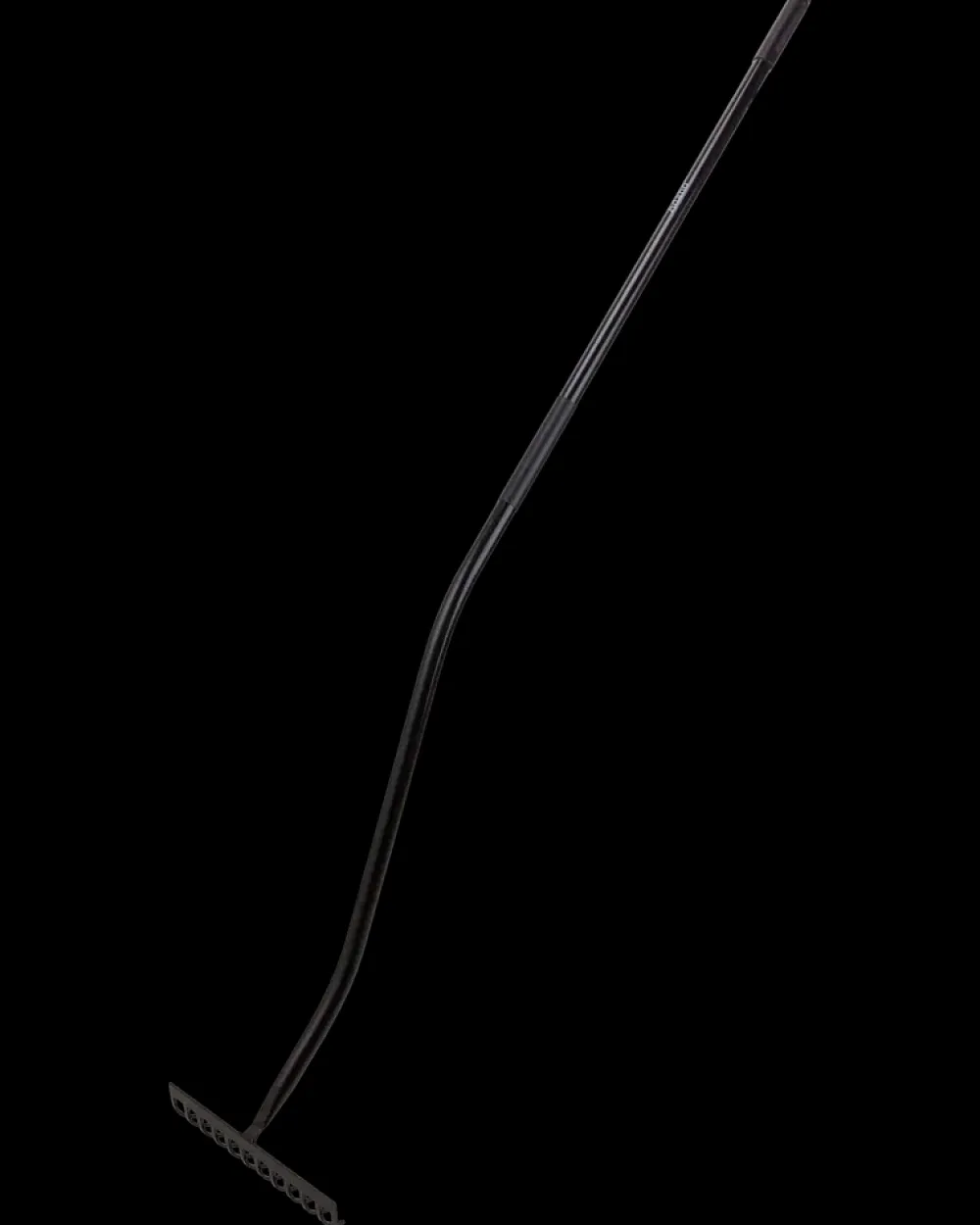 Ergonomisk rive med skaft og hoved i pulverlakeret stål.Skaftet har to gummigreb, som sikrer et godt greb selv med hansker på.