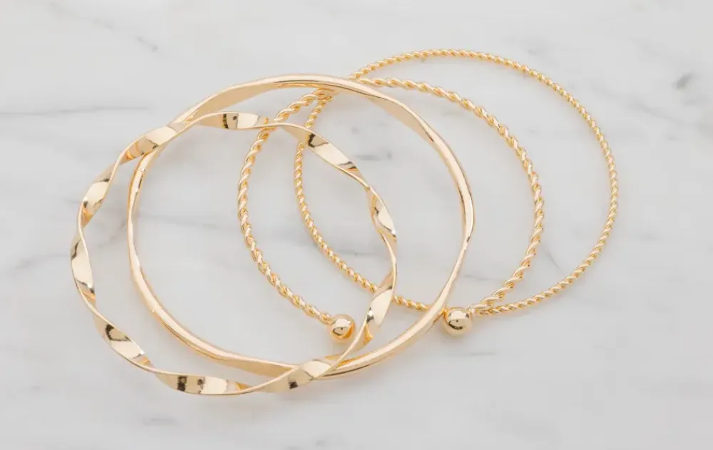 Sæt med 4 guldfarvede armbånd i forskellige designs, der kan bæres sammen eller hver for sig. Sættet inkluderer et snoet armbånd, to armbånd med let buede former og et smalt armbånd med små dekorative sten. Velegnede til både hverdagsbrug og festlige anledninger. Armbåndene er nikkelfri og skånsomme mod huden.De er ikke vandresistente og bør opbevares tørt for at bevare deres glans og holdbarhed.