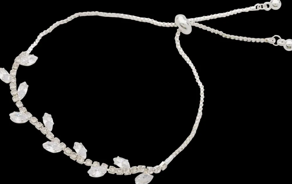 Sølvfarvet armbånd med glitrende sten i et elegant bladinspireret design. Kæden er dekoreret med små sten, der skaber et eksklusivt look.Armbåndet har en justerbar lukning, så det kan tilpasses i størrelsen. Velegnede til både hverdagsbrug og festlige anledninger. Armbåndet er nikkelfrit og skånsomme mod huden, hvilket sikrer en behagelig pasform. De er ikke vandresistente og bør opbevares tørt for at bevare deres glans og holdbarhed.
