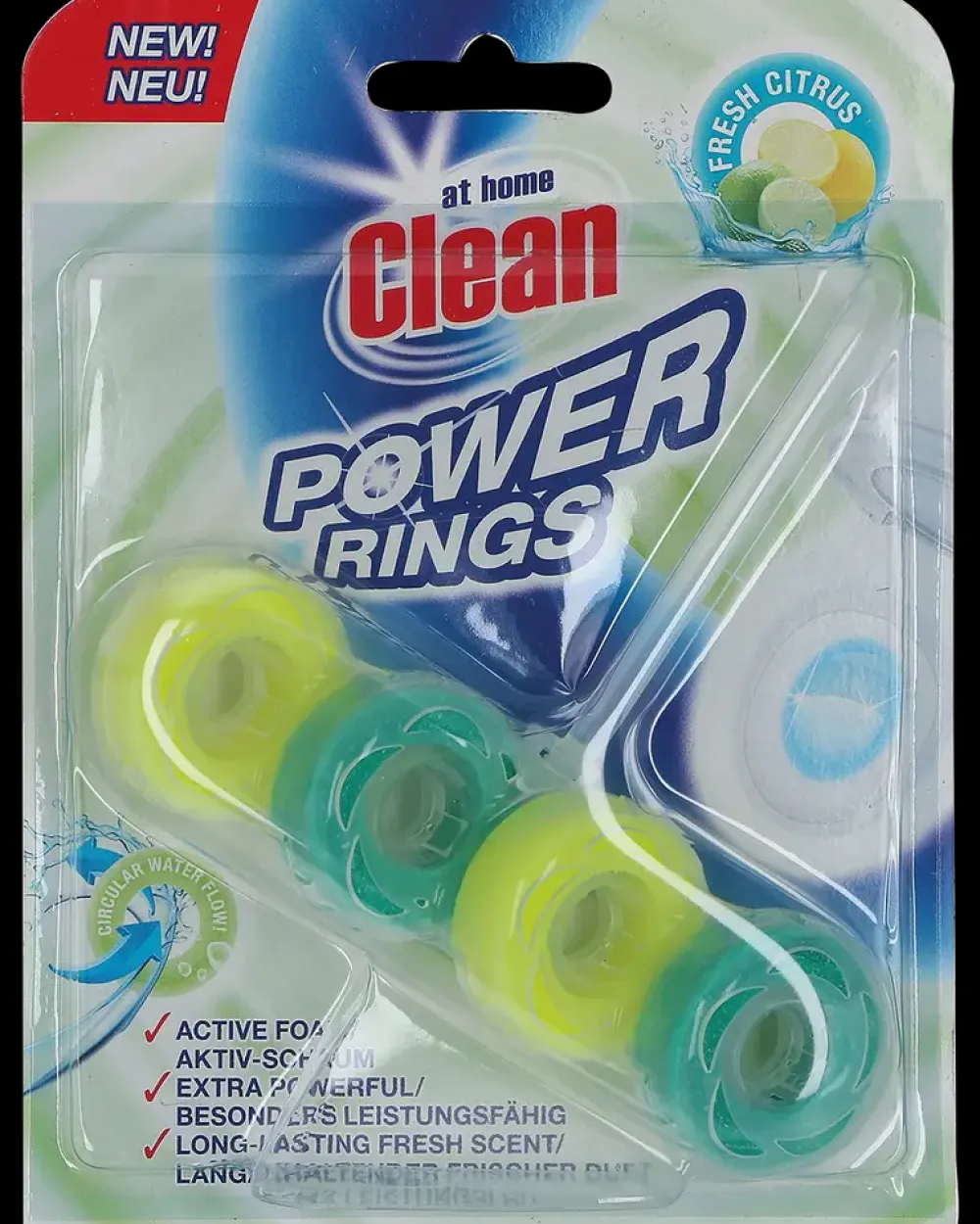 Toiletblok fra At Home Clean, der hjælper med at holde indersiden af toilettet frisk og skinnende samtidig med at der afgives en behagelig duft. Blokken har 4 ringe for at optimere vandstrømningen.