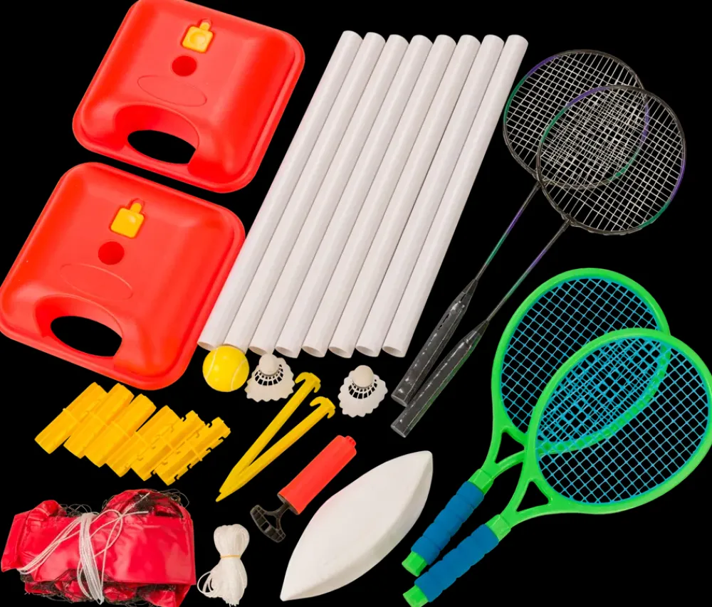 Ketsjere, bolde og net til hhv. badminton, tennis og volleyball. Så er der lagt op til mange timers sjove boldlege.Sættet indeholder:2 badmintonketsjere.2 fjerbolde.2 tennisketsjere.1 tennisbold.1 volleyball.1 pumpe. 1 net (4 dele – Højde 156 cm).