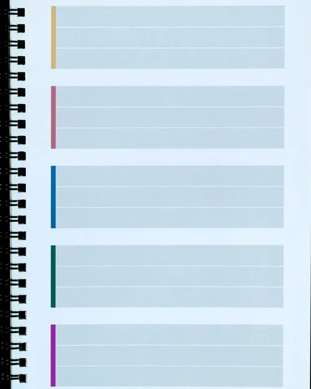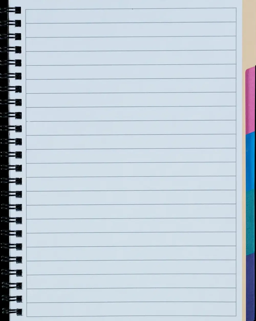 Smart index-spiralblok med farvede index-faner til forskellige emner.Blokken er med side-perforering.Blokken indeholder linjeret papir.5 x 15 ark.Linjeret papirPapir 70 g.