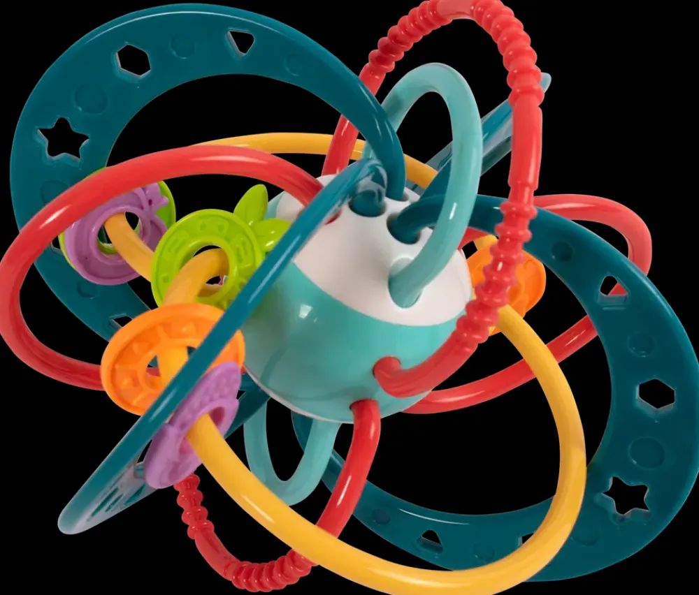 Denne motorikbold er specielt designet til at stimulere babyens sanser og træne finmotorikken.Bolden har også en klokkelyd indeni, der skaber en sjov og underholdende lyd, når den rystes eller ruller. Dette hjælper med at tiltrække babyens opmærksomhed og stimulere høresansen.Ved at gribe bolden og udforske dens forskellige overflader og lyde, træner babyen sin finmotorik og hånd-øje koordination.