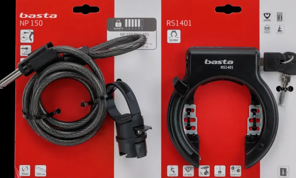 Sæt med cykellås og kædelås fra Basta. Cykellåsen er af typen RS1401 med hus og låsearm af rustbeskyttet hærdet stål. Kædelåsen er af typen NP150 og har en længde på 150 cm samt en diameter på 10 mm. RS1401: Forsikringsgodkendt i hele Skandinavien og godkendt af Varefakta. Skruer medfølger ikke.