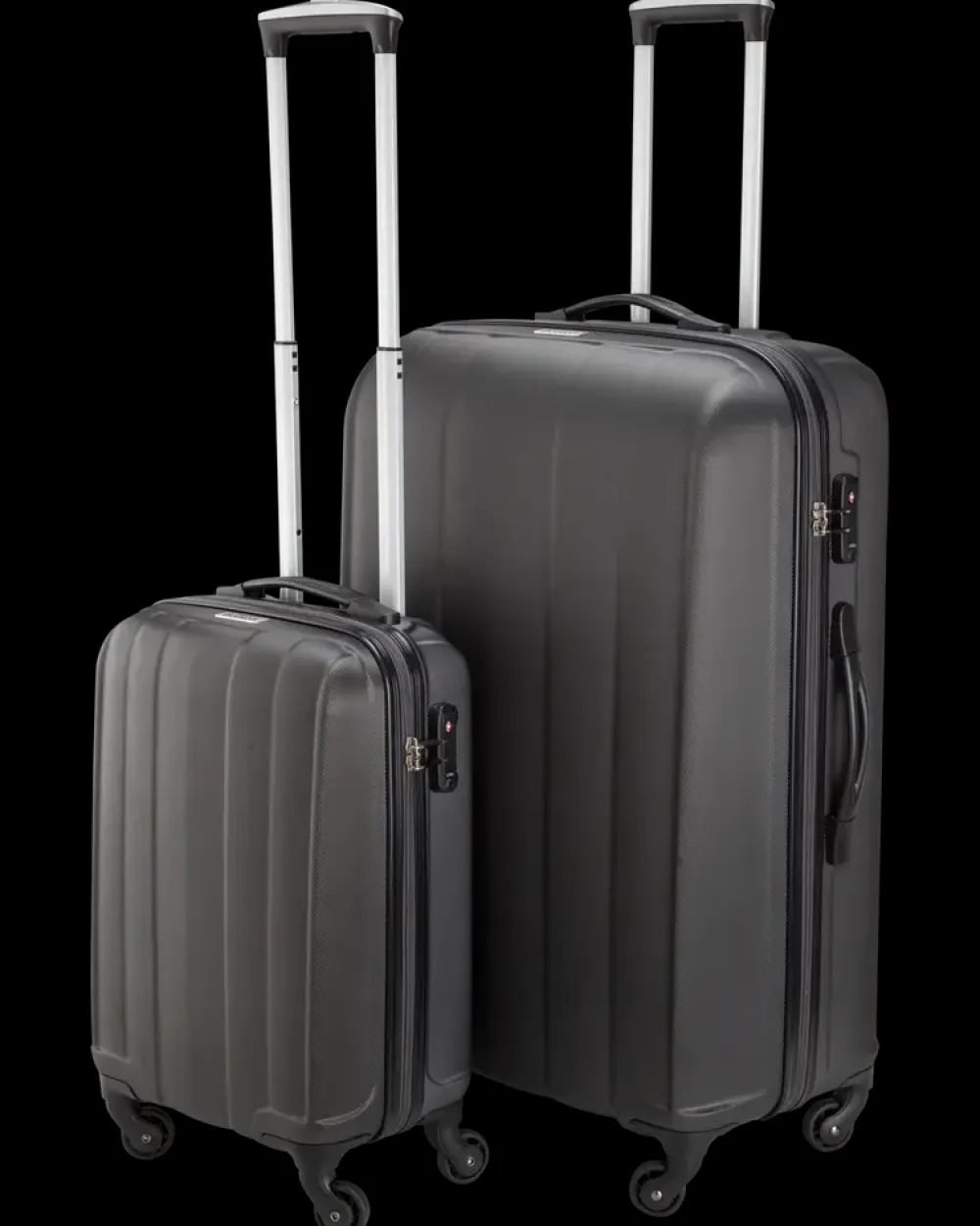 Lækre kufferter i ABS-plastik med udtrækshåndtag og TSA lås. Begge har 4 hjul der er 360° roterbare.Lille kuffert:Indhold: 32 literUdvendige mål: H. 55 x B. 34 x D. 21 cm.Vægt: 2,5 kg.Maks. vægt: 15 kg.Stor kuffert:Indhold: 101 literUdvendige mål: H. 78 x B. 52 x D. 28,5 cm.Vægt: 4,1 kgMaks. vægt: 20 kg.