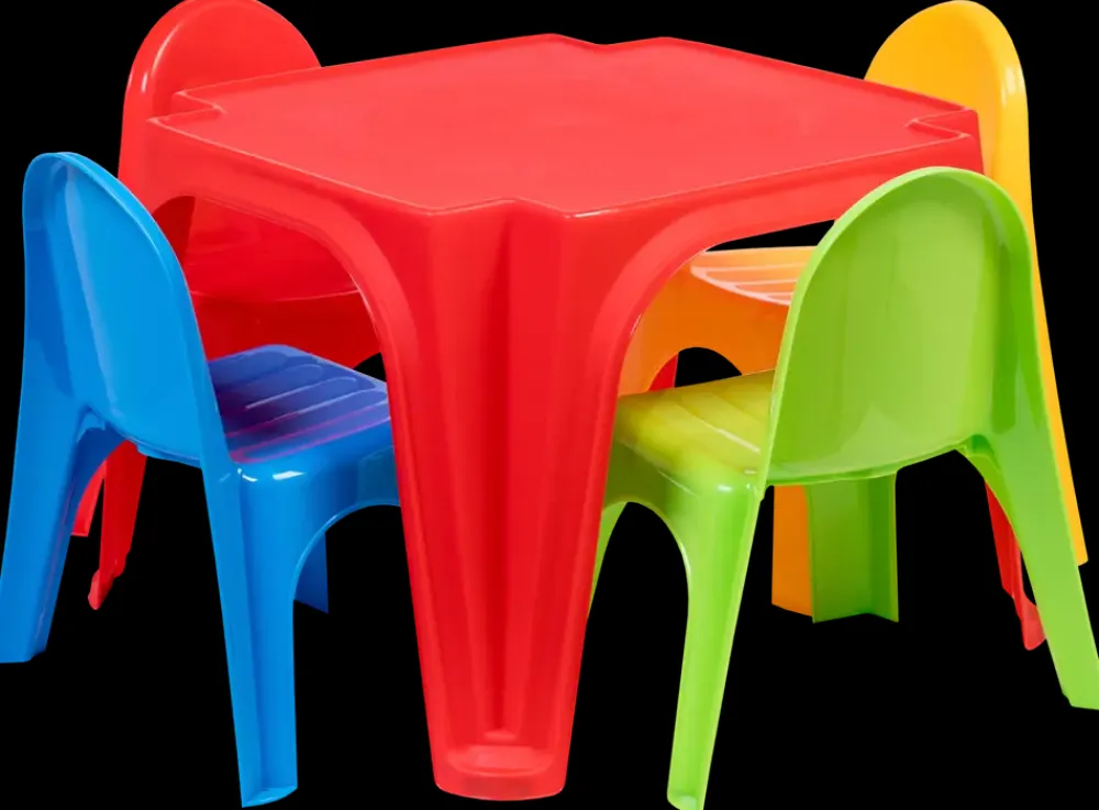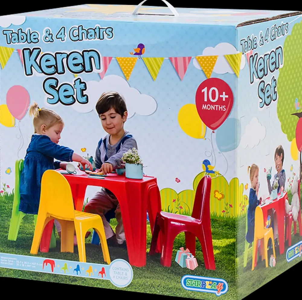 Dette sæt med børnebord og 4 stole er perfekt til både indendørs og udendørs brug.Det tilføjer en sjov og farverig atmosfære til ethvert børneværelse, have eller terrasse.Kan bruges udendørs og indendørs.Bordet har non-slip fødder, der sikrer stabilitet og forhindrer, at det glider eller vælter under leg.Lavet af UV resistent materiale der ikke falmer af sollys.Bord: B. 55 x L. 55 x H. 37,5 cmStol: B. 28 x L. 35 x H. 41 cmMaks. belastning: stol 25 kg og bord 40 kg.Materiale: Plast der er UV resistent mod sollys.