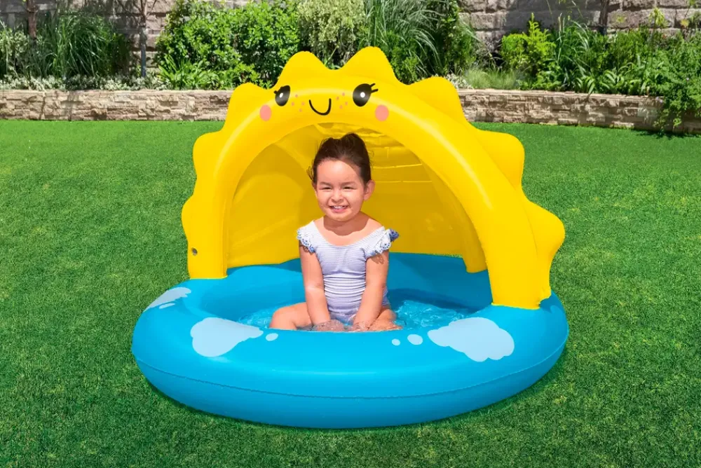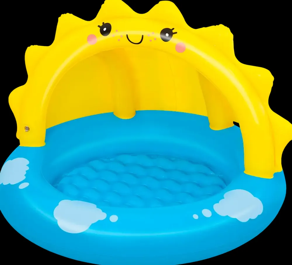 Oppustelig børnepool til leg og afkøling i haven på varme dage. Poolen er udstyret med en integreret, oppustelig solskygge, som giver skygge under brug og reducerer direkte sollys ovenfra. Den lave vanddybde gør poolen velegnet til mindre børn under opsyn.Poolen har rund form og en blød, oppustelig bund, der giver barnet en stabil og behagelig siddeplads under leg. Konstruktionen er let at fylde og tømme og kan placeres på græs eller andet jævnt underlag.Fremstillet i PVC og beregnet til udendørs brug i sommersæsonen.Mål og specifikationer:Diameter: Ø101 cmKapacitet: 26 literMateriale: PVCFarve: Blå og gulAnbefalet alder: Fra 2 år