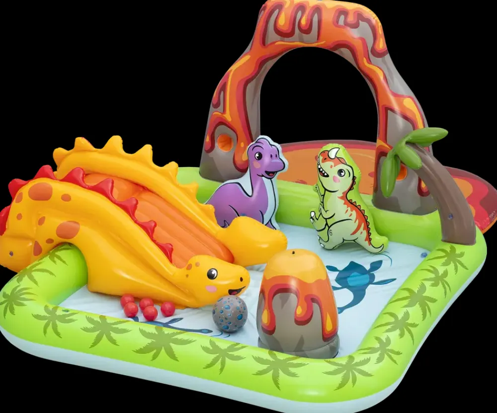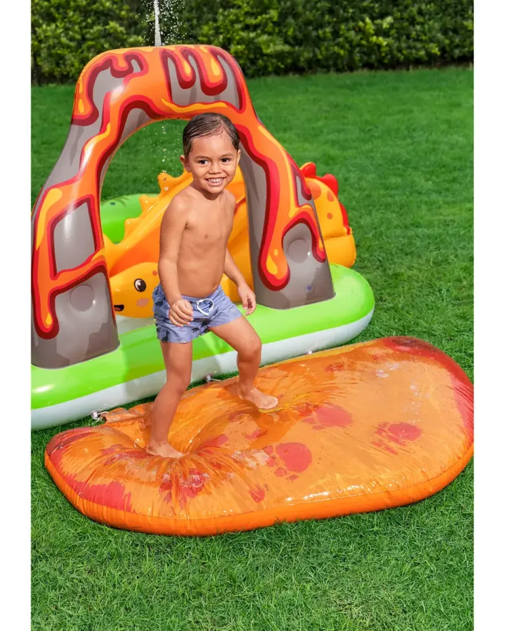 Børnepool Volcano Springs er et oppusteligt legeområde til vandleg for børn fra 2 år. Poolen kombinerer lav vanddybde med rutsjebane og flere integrerede legeelementer, der egner sig til brug i haven på varme dage.Legecenteret er udformet med dinosaurtema og indeholder oppustelige figurer, bolde og en vulkan med vandfunktion, som kan tilsluttes haveslange. Vandet sprøjter op fra vulkanen og kan anvendes sammen med de medfølgende bolde. En separat oppustelig vandmåtte kan bruges både sammen med poolen og alene.Ved rutsjebanens afslutning er bunden oppustelig for at give en blød overflade under leg. Poolen har aftapningsventil, så vandet let kan tømmes efter brug. Når den ikke er i brug, kan poolen foldes sammen. Reparationslap medfølger.Kapacitet pool: 150 literKapacitet vandmåtte: 80 literMateriale: PVC