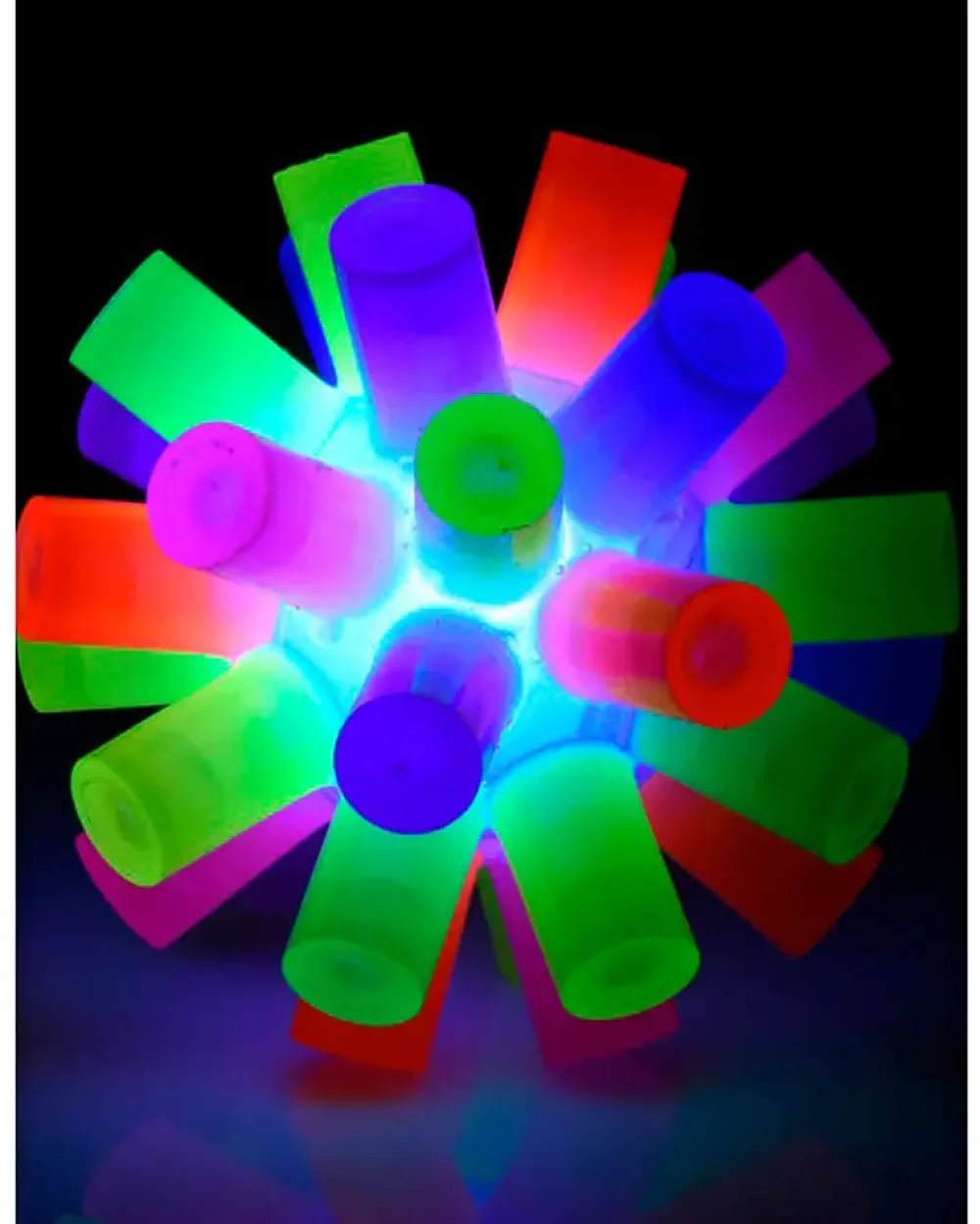 Sjov og farverig bold der fungerer som en hoppebold – den lyser desuden, når man kaster med den.Bolden er lavet i et blødt gummimateriale.