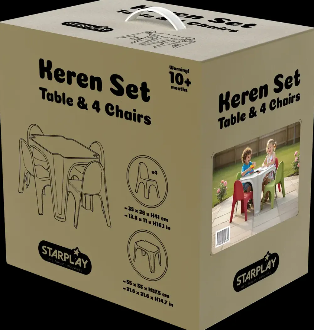 Børnesæt med bord og fire stole til leg, tegning og måltider. Sættet kan anvendes både inde og ude og giver en fast plads til aktiviteter i børneværelse, på terrasse eller i haven. Konstruktionen er let at flytte rundt på, samtidig med at den står stabilt under brug.Stole og bord er formet til børn og passer til daglige aktiviteter som kreative projekter, spil og snacks. Fødder med skridsikring bidrager til stabilitet og reducerer risiko for at glide på glatte underlag.Materialet er plast med UV-resistens, som mindsker påvirkning fra sollys ved udendørs brug. Overfladerne er glatte og kan aftørres efter brug.Mål:Bord: H. 37,5 x B. 55 x L. 55 cmStol: H. 41 x B. 28 x L. 35 cmMaks. belastning: stol 25 kg, bord 40 kgMateriale: Plast (PP Prolypropylen)Farve: Gråt bord med røde og grønne stole