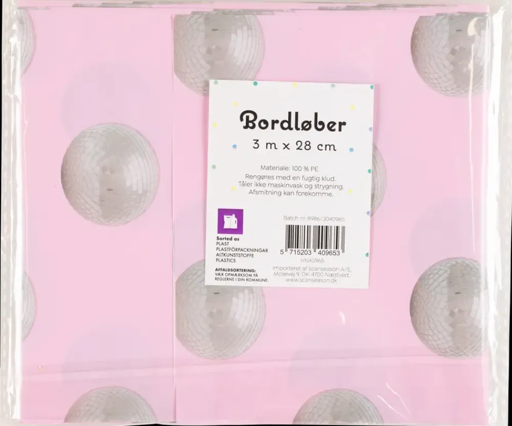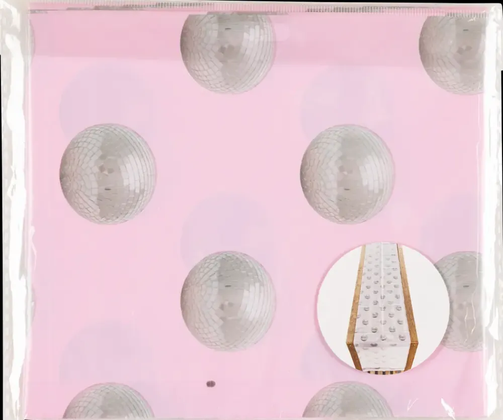 Gør din borddækning til et blikfang med vores bordløber i lyserødt design med sølvfarvede diskokugler. Med en bredde på 28 cm og en længde på 3 meter, er denne løber perfekt til at skabe en festlig stemning ved enhver temafest.