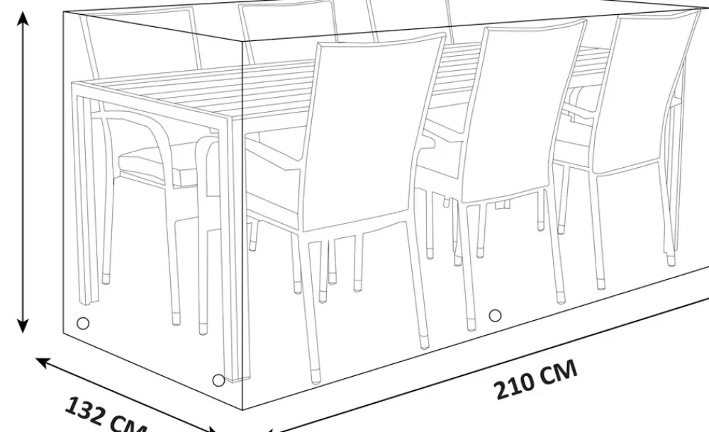 Bordovertrækket bruges til at beskytte et udendørs bord eller et mindre havesæt mod regn, støv og solens stråler. Det er fremstillet af letvægts 75gsm oxford-stof med PU-belægning, som giver en vandafvisende overflade og gør materialet nemt at håndtere. Alu-øjer langs kanten medvirker til ventilation, så fugt kan slippe ud under brug.Overtrækket måler H.112 x B.132 x L.210 cm og dækker et udendørs bord med tilhørende stole. Det er sort og har en glat tekstiloverflade med synlige metaløjer. Det rengøres med en fugtig klud og bør være helt tørt, før det lægges til opbevaring.