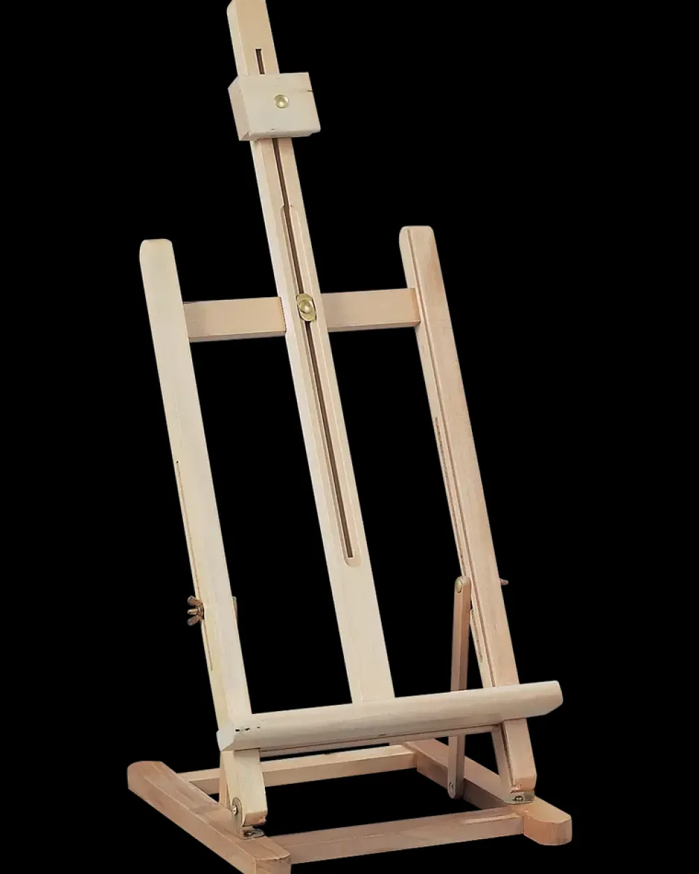 Praktisk staffeli i træ, uden ben så det kan placeres på et bord eller andet møbel.Når staffeliet ikke er i brug kan det klappes sammen og pakkes væk.Maks. lærredsmål: 55 cm.Sammenklappeligt.