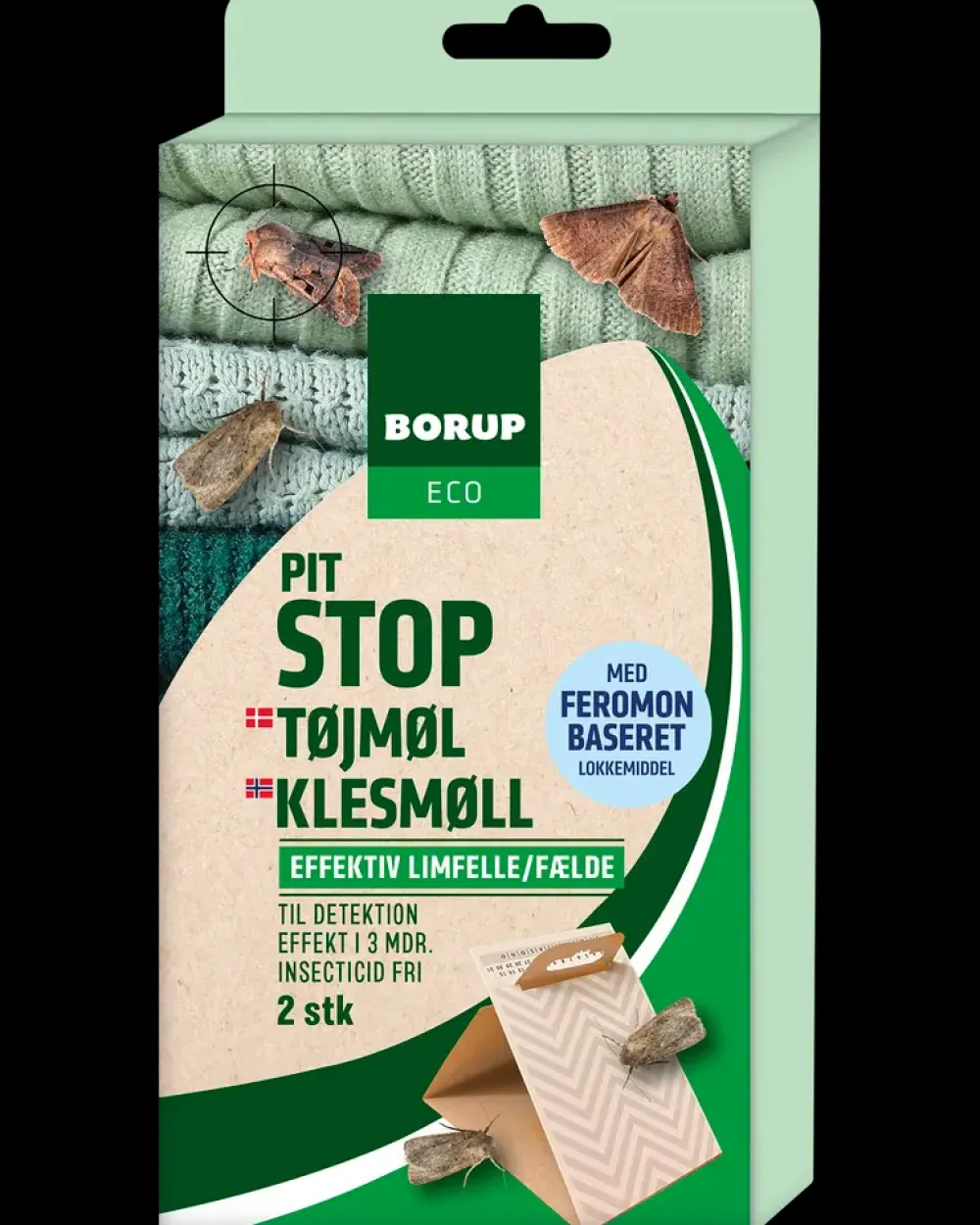 Borup ECO Tøjmøl Stop er en limfælde til beskyttelse af tekstiler mod tøjmøl i hjemmet. Produktet anvendes til detektion og reduktion af tøjmøl i skabe, skuffer og opbevaringsrum, hvor tøj, møbler eller tæpper opbevares. Fælden tiltrækker tøjmøl ved hjælp af et feromonbaseret lokkemiddel og fastholder dem effektivt på limoverfladen.Limfælden fungerer uden brug af insekticider og afgiver ingen lugt, hvilket gør den velegnet til brug i lukkede rum som garderobeskabe og kommoder. Den bruges både som forebyggelse og til at identificere begyndende angreb af tøjmøl. Når fælden er placeret, arbejder den kontinuerligt og giver synlig indikation af aktivitet.Produktet har en virkning på op til 3 måneder pr. fælde, afhængigt af omgivelserne. Antal: 2 stkType: Limfælde til tøjmølVirketid: Op til 3 månederEgenskaber: Insekticidfri og lugtfri