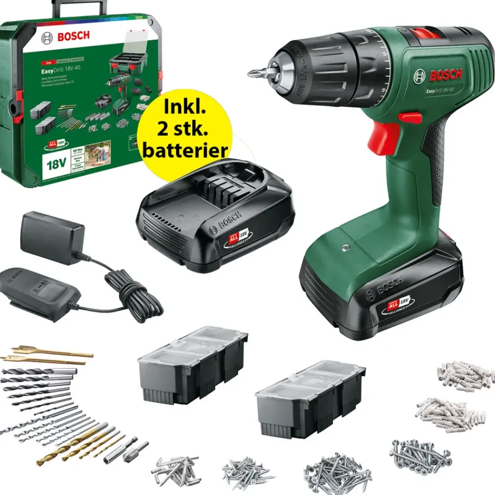 Bosch EasyDrill 18V-40 er en batteridrevet skruemaskine til boring og skruning i træ, metal og plast. Maskinen er udstyret med 2-trins-gearkasse og 20 momentindstillinger, som giver kontrol ved både præcisionsskruning og boring med højere hastighed. Den 13 mm selvspændende borepatron med én ring gør det nemt at skifte mellem bits og bor.Den kompakte konstruktion og ergonomiske udformning giver et stabilt greb under arbejdet. Integreret LED-lys oplyser arbejdsområdet ved arbejde i skabe, hjørner og andre områder med begrænset lys. Gear I anvendes til skruning og større bor, mens Gear II bruges til mindre bor og højere omdrejninger.Sættet leveres inkl. 2 x 1,5 Ah 18V batterier og lader samt SystemBox med 241 dele, herunder bor, bits, skruer og rawlplugs. SystemBoxen kan anvendes alene eller sammenkobles med andre kompatible bokse og har både lodret og vandret håndtag.Tekniske data:Nominel spænding: 18 VOmdrejninger ubelastet: 0–430 / 0–1.630 min⁻¹Maks. moment: 40 NmMomentindstillinger: 20Borepatron: 13 mmMaks. borediameter træ: 30 mmMaks. borediameter stål: 13 mmVægt: 1,3 kg (med 1,5 Ah batteri)