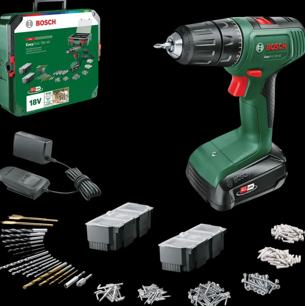AKKU Bore-/skruemaskine EasyDrill 18V-40 fra Bosch.Det ergonomiske design sikrer komfortabel håndtering, mens LED-lysene letter arbejdet på dårligt oplyste steder.Den leverer den kraft, du skal bruge til arbejde i træ, metal og plast takket være en 2-trins-gearkasse og 20 momentindstillinger.Det er let at skifte mellem bor og bits takket være 13 mm borepatronen med én ring.Den medfølgende SystemBox kan bruges til opbevaring af enkeltdele. SystemBox’en kan anvendes alene eller kobles sammen med forskellige SystemBoxe. Med det integrerede lodrette og vandrette håndtag er SystemBoxene lette at transportere.Værktøjet er en del af POWER FOR ALL ALLIANCE. Ét batteri kan bruges til en lang række værktøjer fra forskellige producenter. Leveres med batteri og lader.Borekapacitet i træ/metal/plast: 30/13 mm.