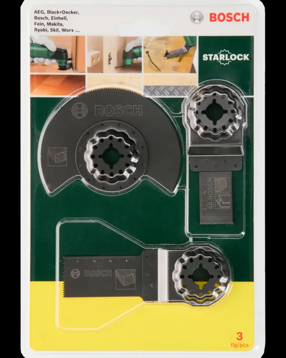 Startsæt med 3 dele, træ, til multifunktionsmaskiner.Indhold: 1 Starlock BIM-savklinge til dyksnit til træ og metal, 1 Starlock HCS-savklinge til dyksnit til træ, 1 Starlock HCS-segmentsavklinge til træ.