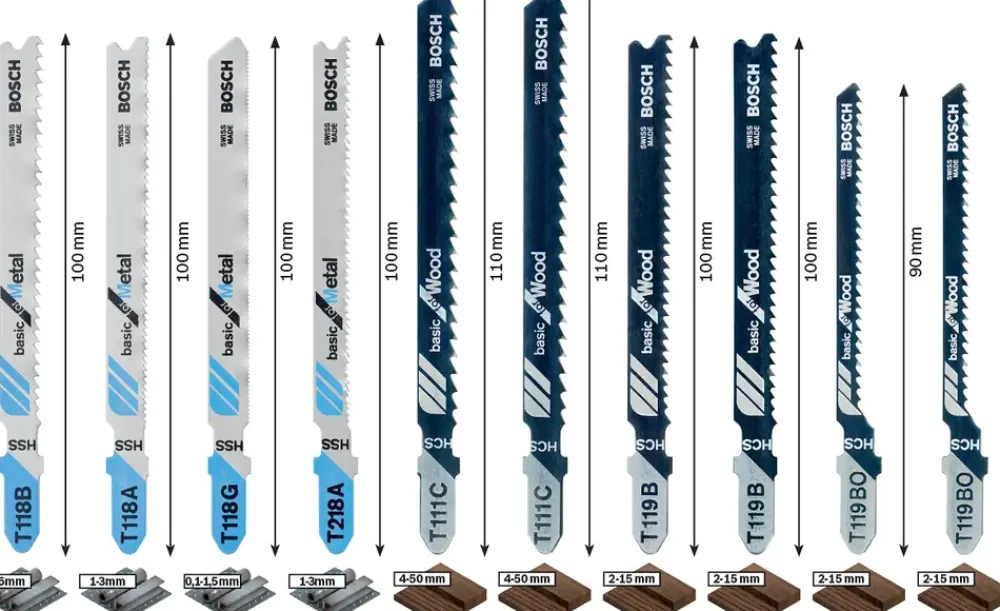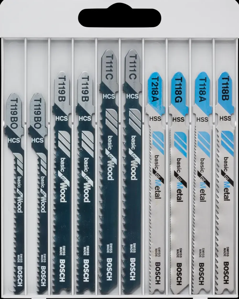 Stiksavssæt til mange typer saveopgaver og giver optimal arbejdsresultater i træ og metal.Klingerne der bruges til træ, er til lige snit og kurvesnit i blødt træ.Klinger til metal og metalrør er til lige snit.Disse klinger er beregnet til stiksave med T-holder.Sættet består af 10 stiksavsklinger:2 x T 119 BO Basic for Wood.Tandudførelse: bølget, fræset.Samlet længde: 83 mm.Tanddeling: 2,0 mm.Anvendelsesområder: Blødt træ (2-15 mm), krydsfiner, spån-, møbel-, fiberplader, specielt til kurvesnit.Anbefalet min. materialetykkelse: 2 mm.Anbefalet max. materialetykkelse: 15 mm.2 x T 119 B Basic for Wood.Tandudførelse: bølget, fræset.Samlet længde: 92 mm.Tanddeling: 1,9-2,3 mm.Anvendelsesområder: Blødt træ (2-15 mm), krydsfiner, spån-, møbel-, fiberplader.2 x T 111 C Basic for Wood.Tandudførelse: Udlagt, fræset.Samlet længde: 100 mm.Tanddeling: 3,0 mm.Anvendelsesområder: Blødt træ (4-50 mm), spån-, møbel-, fiberplader, hurtigt snit.Anbefalet min. materialetykkelse: 4 mm.Anbefalet max. materialetykkelse: 50 mm.1 x T 218 A Basic for Metal.Tandudførelse: bølget, fræset.Samlet længde: 92 mm.Tanddeling: 1,1-1,5 mm.Anvendelsesområder: Tynde plader (1-3 mm), specielt til kurvesnit.1 x T 118 G Basic for Metal.Ikke-jernholdigt metal/Aluminium.Tanddeling: 0,7 mm / 36 TPI.Totallængde: 91 mm.Fortandet længde: 68 mm.1 x T 118 A Basic for Metal.Ikke-jernholdigt metal/Aluminium.Tanddeling: 1.1–1.5 mm / 17–23 TPI.Totallængde: 91 mm.Fortandet længde: 68 mm.1 x T 118 B Basic for Metal.Ikke-jernholdigt metal/Aluminium.Tanddeling: 1.9–2.3 mm / 11–13 TPI.Totallængde: 91 mm.Fortandet længde: 68 mm.