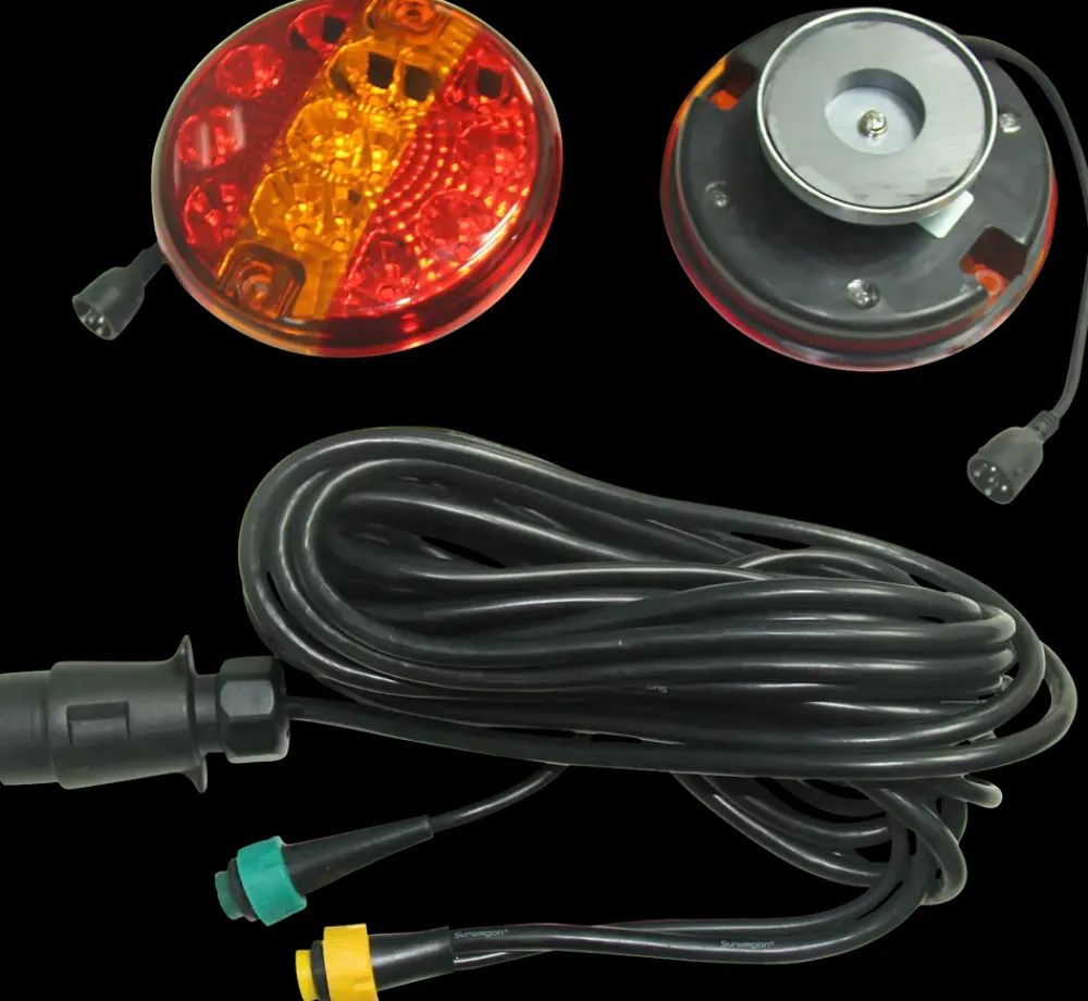 Magnetisk traktorlygtesæt fra Branford.Stop, bak, blinklys.Ø. 140 mm.Kabellængde: 2,5 meter og 7,5 meter.Antal LED pr. lygte: 14 stk.Med integreret LED.