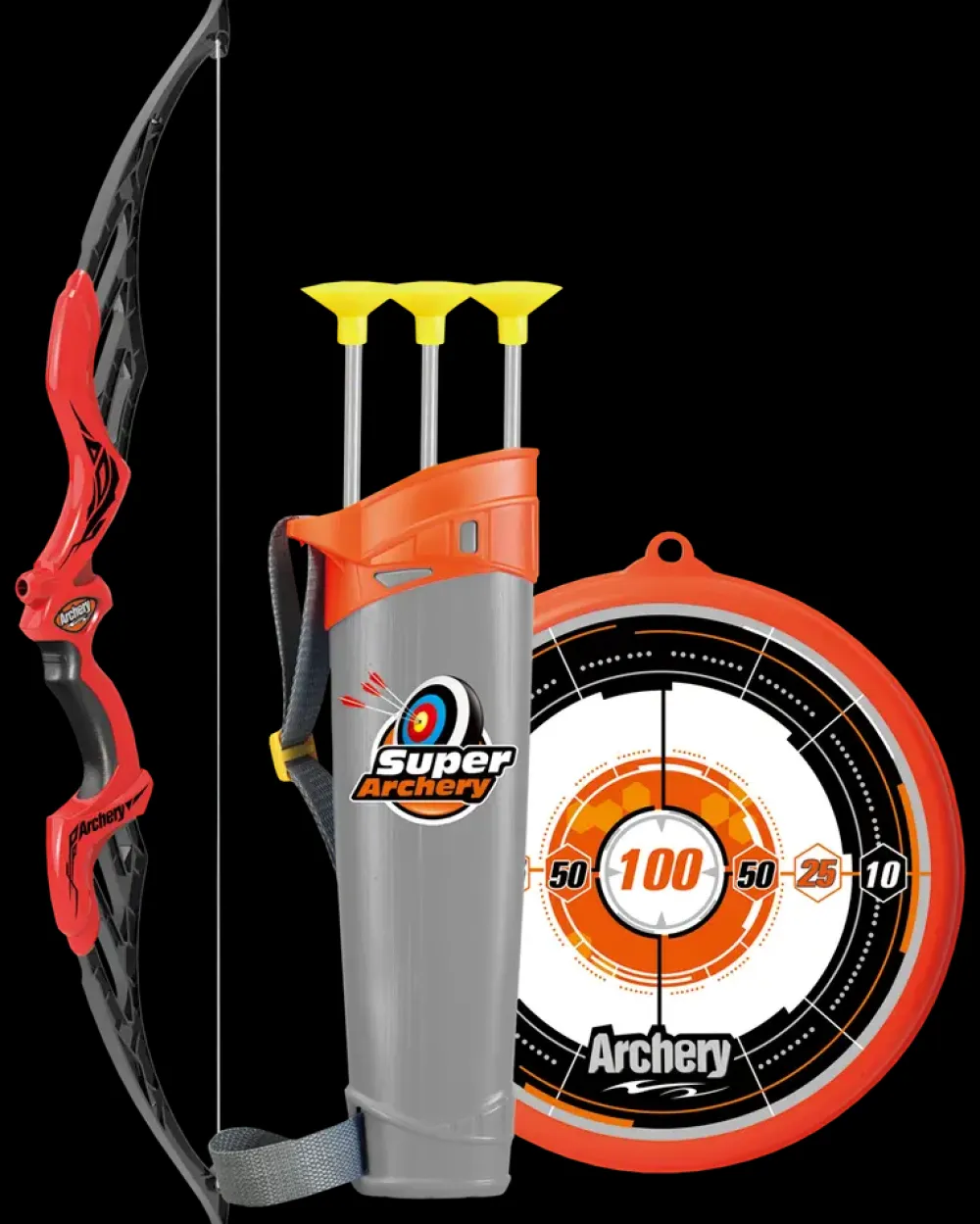 Sæt med bue, pile og sigteskive.Pilespidserne er med sugekopper, så de kan hænge fast på sigteskiven.Der medfølger 3 pile.Bue: L. 66 cm.Skydeskive: Ø20 cm.Pile: L. 41 cm.