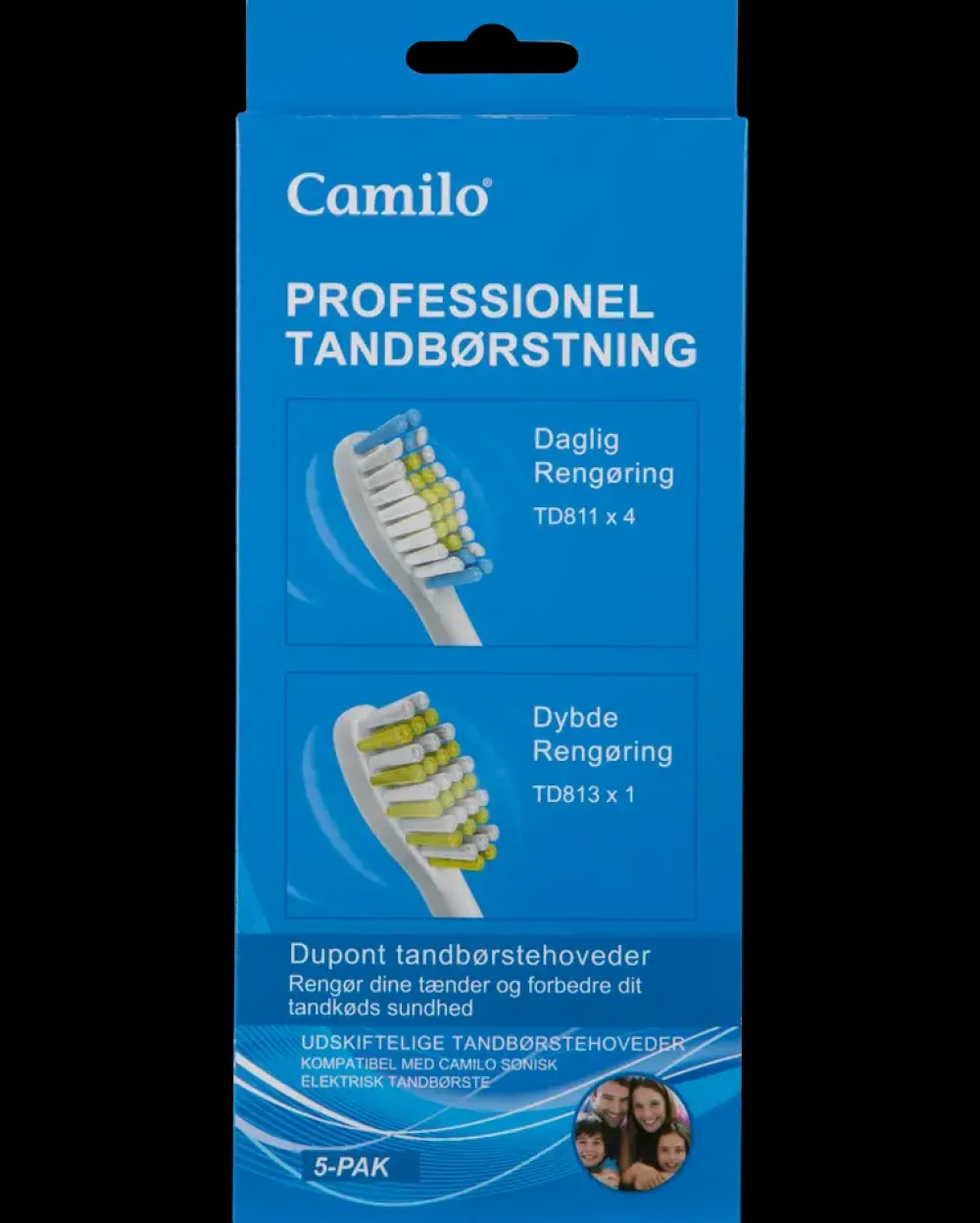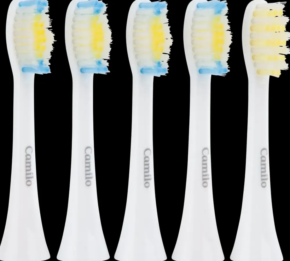 Børstehoveder til Camilo sonisk el-tandbørste. 3D Dupont børstehoveder for professionel tandbørstning. Rengør op til 100% plak og forbedre dit tandkøds sundhed. Det anbefales at udskifte tandbørstehoved hver 3. måned. Indhold: 4 stk. børster med bølgedesign og 1 stk. børste med 5 graders hældning på de yderste børster.