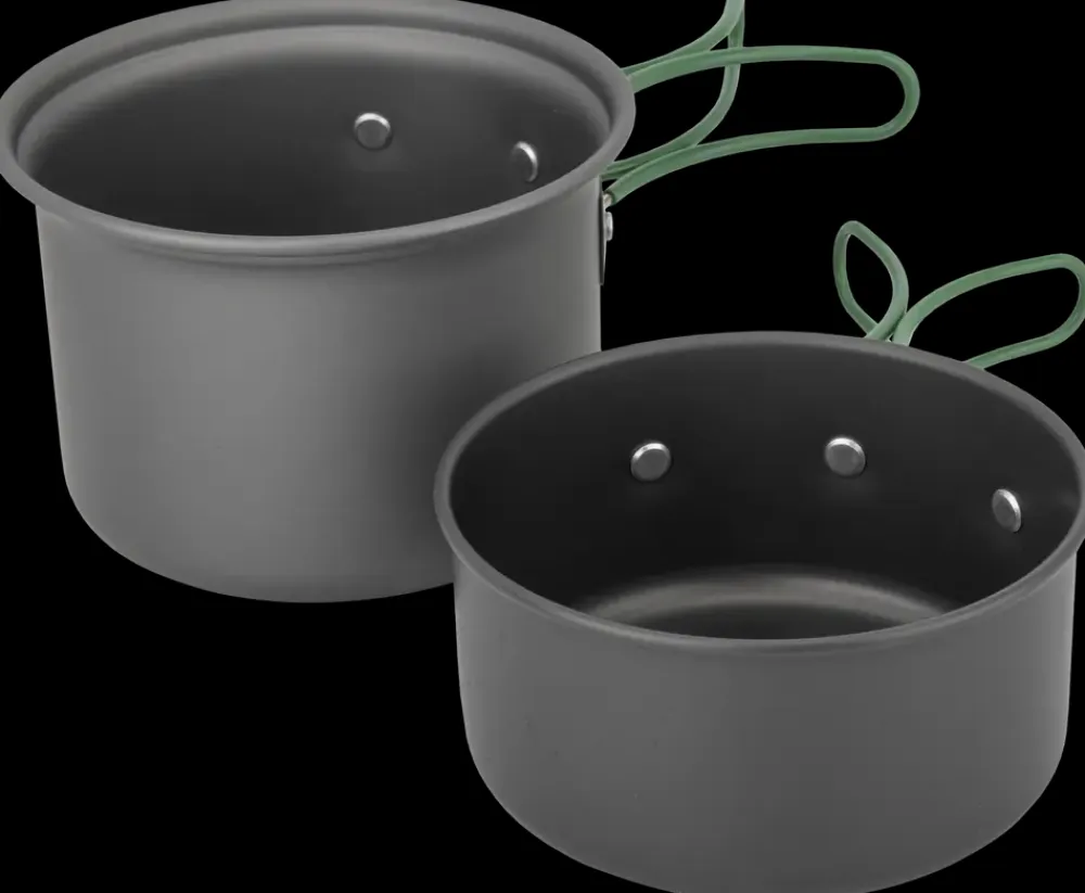 Dette kasserollesæt er fremstillet af anodiseret aluminium og rustfrit stål, hvilket sikrer holdbarhed og effektiv varmefordeling.Sættet består af to kasseroller:950 ml (Ø 13 cm, H 9 cm)550 ml (Ø 12 cm, H 6 cm)Begge har foldbare håndtag for nem opbevaring og transport. Ideelt til camping, outdoor-brug eller små køkkener. Det lette, men robuste materiale gør dem nemme at håndtere i daglig brug.