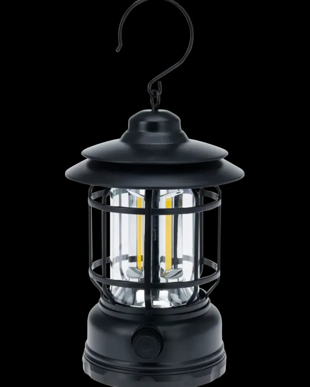 Campinglygte til belysning i telt, på terrassen eller andre udendørs områder. Modellen fungerer som en genopladelig lyskilde og kan bruges, hvor der er behov for mobil og fleksibel illumination.Lygten har en beskyttende gitterkonstruktion omkring lyskilden og en øvre skærm, der reducerer direkte blænding. En integreret drejeknap ses på fronten, hvilket giver mulighed for styring af lyset. En krog i toppen gør det muligt at hænge lygten op i reb, grene eller stativ. USB-tilslutningen giver opladning via powerbank eller anden strømkilde.Den cylindriske form og den matte, mørke overflade er tydeligt synlige. Konstruktionen fremstår som en kombination af hård plast og metal i de bærende dele. Lyskilden består af flere LED-elementer, som giver et jævnt lys.