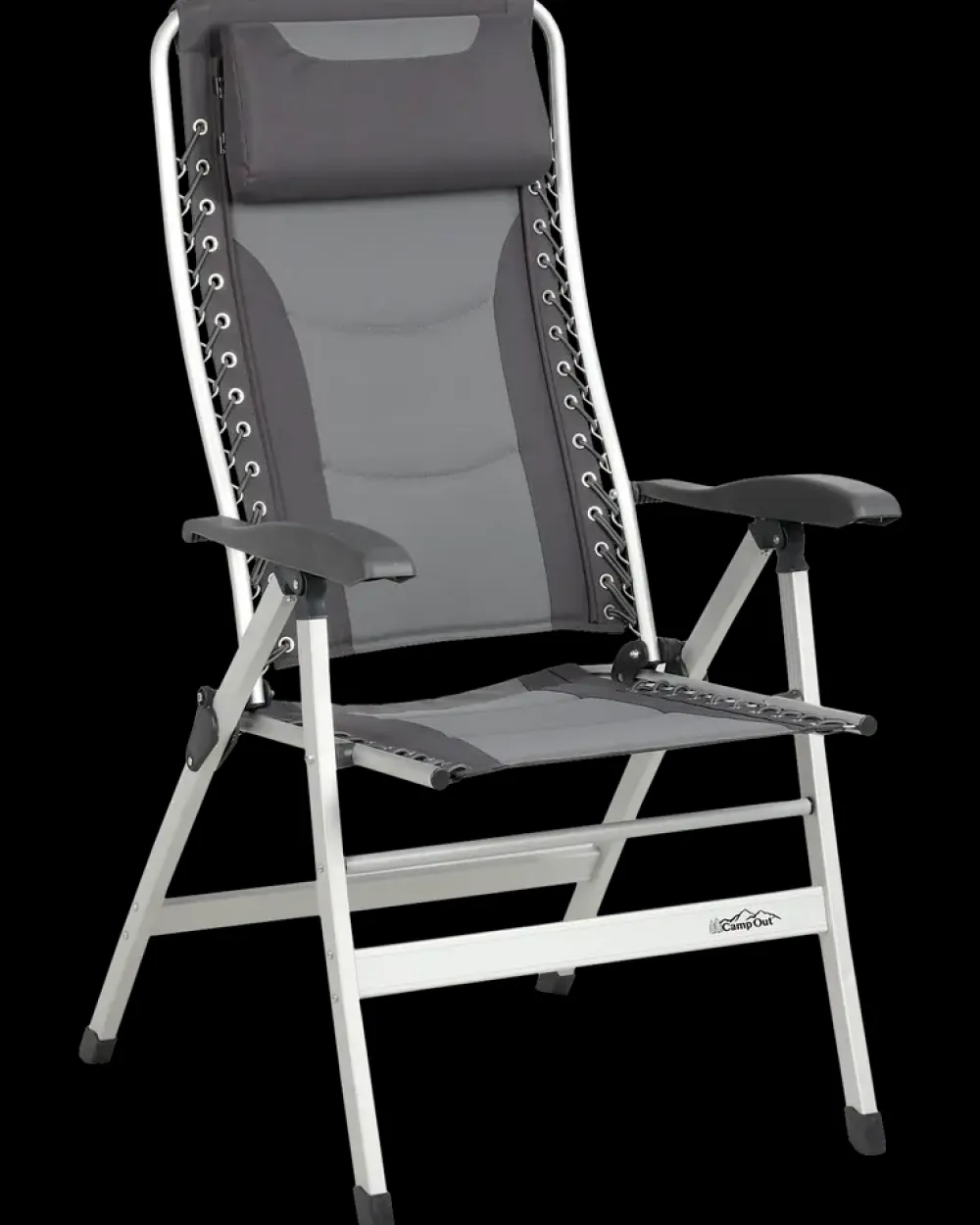 Praktisk campingstol fra CampOut™, i aluminium med textiline materiale og behagelig nakkestøtte.Med justerbart ryglæn i 7-positioner.