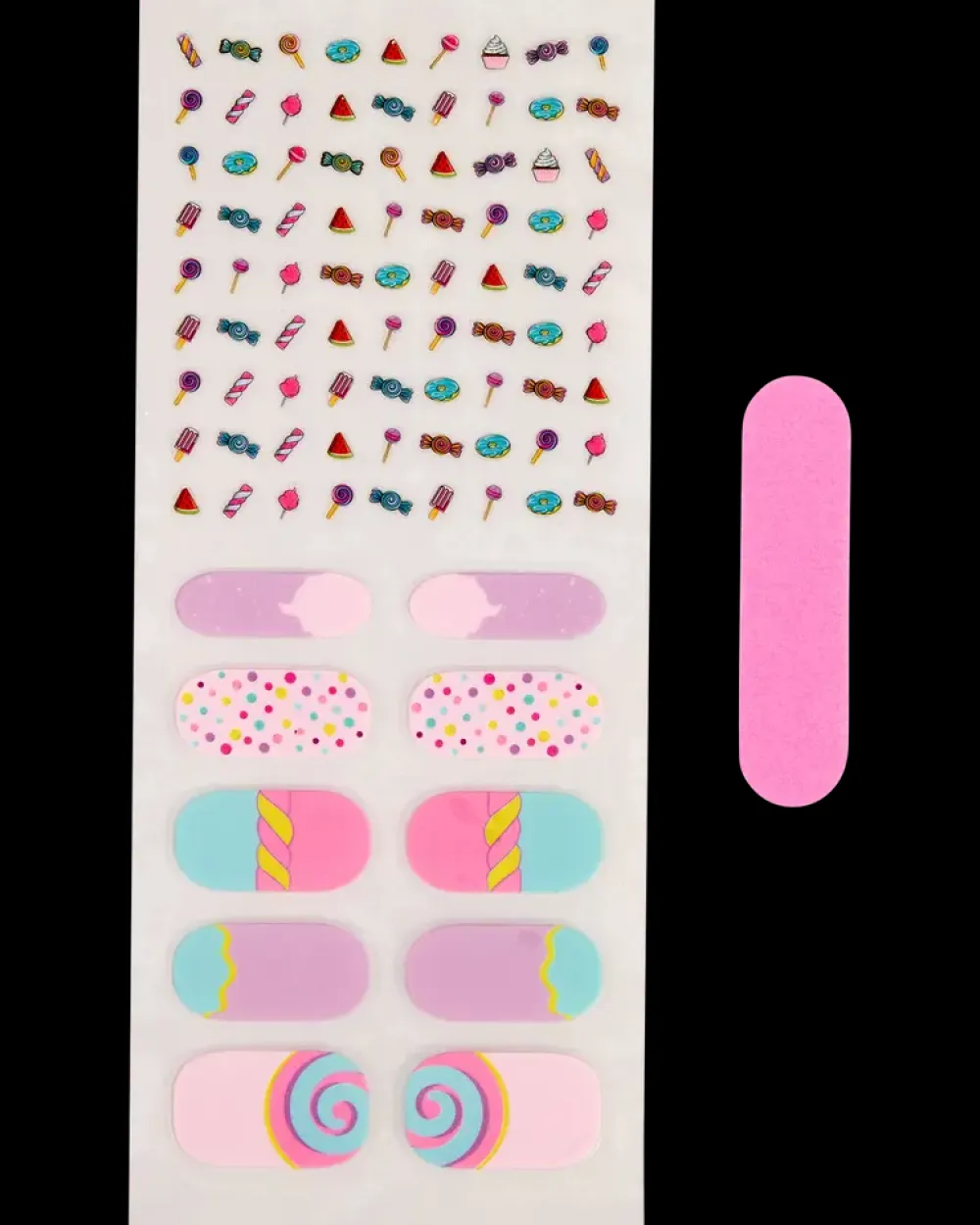 Et sæt neglestickers i sliktema, der bruges som dekorativ pynt på neglene. Motiverne giver mulighed for at skabe et farvet udtryk, som især henvender sig til børn fra 6 år og opefter. Sættet gør det let at variere neglestylen, og den medfølgende fil hjælper med tilpasning af hvert sticker.Arket indeholder flere størrelser, så motivet kan justeres til forskellige negle. Stickers påføres ved at placere dem direkte på neglen og trykke dem fast. De små motivmærker kan kombineres efter behov, mens de større wraps dækker hele neglefladen.Motiverne består af slikikoner og pasteltoner, som giver et legende udtryk. Farverne er tydeligt trykt og giver mulighed for at sammensætte forskellige mønstre.Tekniske detaljerSelvklæbende stickers i assorterede formerFlere størrelserInkl. lille neglefilSliktema i flere farverAldersangivelse: 6+