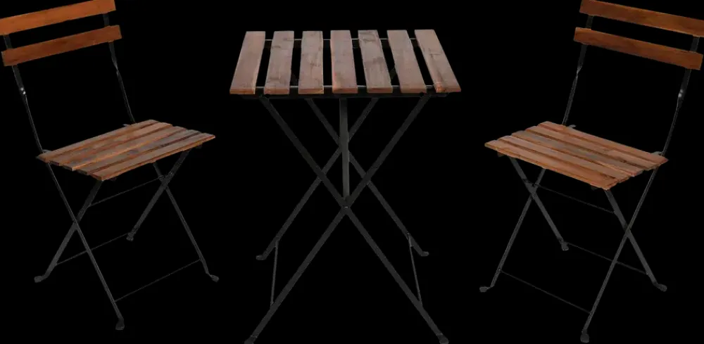 Cafesæt bestående af et bord og to stole i et tidløst design. Stellet er fremstillet af sort pulverlakeret stål, mens bordplade og sæder består af oliebehandlet akacietræ med en flot, mørk glød. Begge dele kan klappes sammen, så sættet er nemt at flytte og opbevare uden at fylde. Sættet egner sig godt til altanen, terrassen eller et hyggeligt hjørne i haven. Akacietræet er oliebehandlet for øget holdbarhed mod vejr og vind.Mål:Bord (udfoldet): L 54 x B 55 x H 72 cmStol (udfoldet): L 39 x B 46 x H 77 cmMateriale: Akacietræ, stålFarve: Mørkebrun, sort