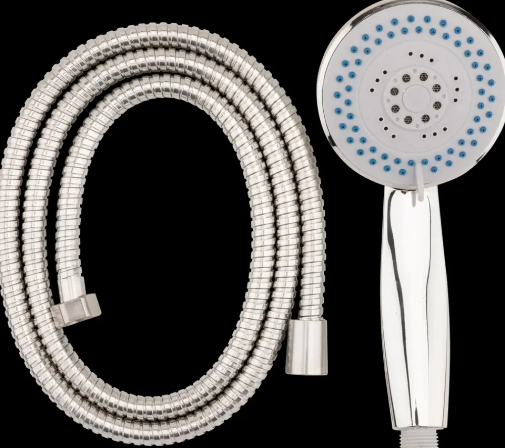 Brusesæt med brusehoved og slange i funktionelt design. Brusehovedet har 5 stråletyper – bl.a. regn, massage og tåge – som let vælges via det ergonomiske greb. Diameter: 7,5 cm.Slangen måler 150 cm og giver god bevægelsesfrihed. Sættet er fremstillet i ABS-plast og rustfrit stål, hvilket sikrer høj holdbarhed og modstandsdygtighed mod korrosion.Den vandeffektive udformning bidrager til reduceret vandforbrug uden at mindske trykket.
