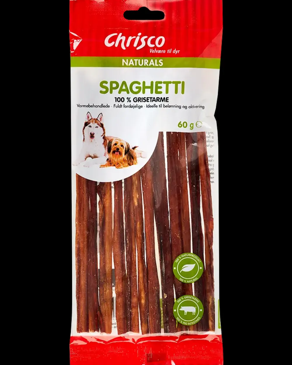 Chrisco spaghetti er et rent og velsmagende naturprodukt. Produktet består af grisetarme formet som lange spaghetti og de er naturligvis helt uden tilsætnings- og farvestoffer.Under fremstillingen af de færdige produkter renses, tørres og varmebehandles grisetarmene. Varmebehandlingen sker under så høje temperaturer, at alle eventuelle bakterier (herunder salmonella) dræbes effektivt.