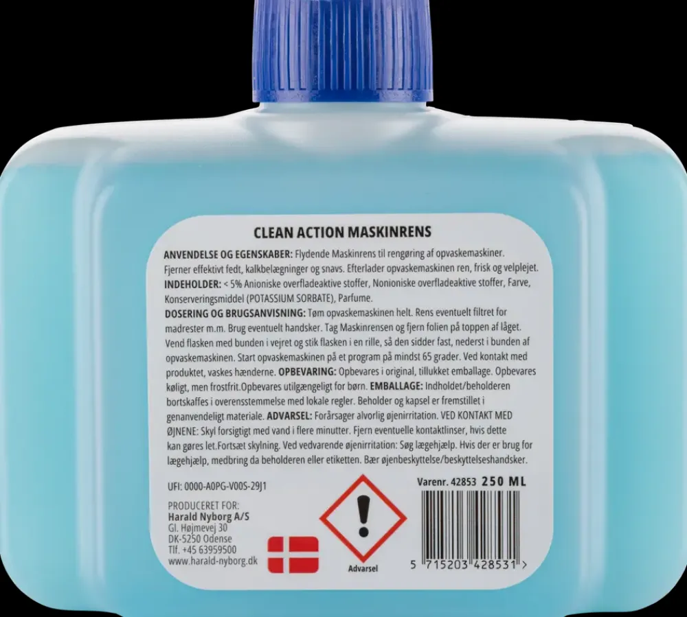 Forlænger levetiden på opvaskemaskinen. Med tiden ophobes fedt, kalk og madrester i opvaskemaskinen. Det kan føre til dårlig lugt, tilstoppede filtre og nedsat effektivitet. Clean Action Maskinrens fjerner skjulte belægninger og sikrer, at maskinen fungerer optimalt.Opløser fedt, kalkaflejringer og sæberester, så opvaskemaskinen efterlades ren og frisk. Regelmæssig brug forbedrer vaskeresultatet og modvirker ubehagelig lugt.Hæld indholdet i sæbeskuffen eller placer flasken med bunden i vejret i bestikkurven. Kør et program ved minimum 60 °C. Ingen manuel rengøring nødvendig.Brug maskinrens én gang om måneden for at reducere risikoen for kalkophobninger, der kan føre til driftsstop og øget energiforbrug.
