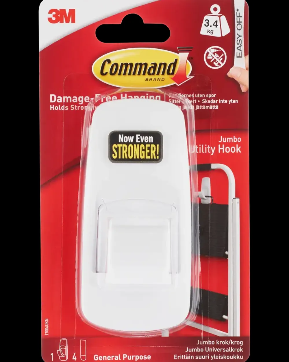 Command™ universalkrog i Jumbo-størrelse er beregnet til indendørs ophængning af tungere genstande som frakker, tasker, håndklæder og andet udstyr i husholdningen. Krogen monteres uden brug af værktøj og fastgøres med en selvklæbende strip, der giver et sikkert greb uden at beskadige underlaget. Når krogen fjernes, efterlades ingen huller, mærker eller klæberester.Produktet er egnet til glatte overflader som malede vægge, fliser, metal og træ. Den store krogflade gør den velegnet til genstande med bredere ophæng, og den høje bæreevne giver mulighed for fleksibel organisering i entré, badeværelse, bryggers eller opbevaringsrum.Pakken indeholder 1 krog og 4 strips.Krogen monteres med én strip.Bæreevne: Op til 3,4 kgFarve: HvidMateriale: Plast