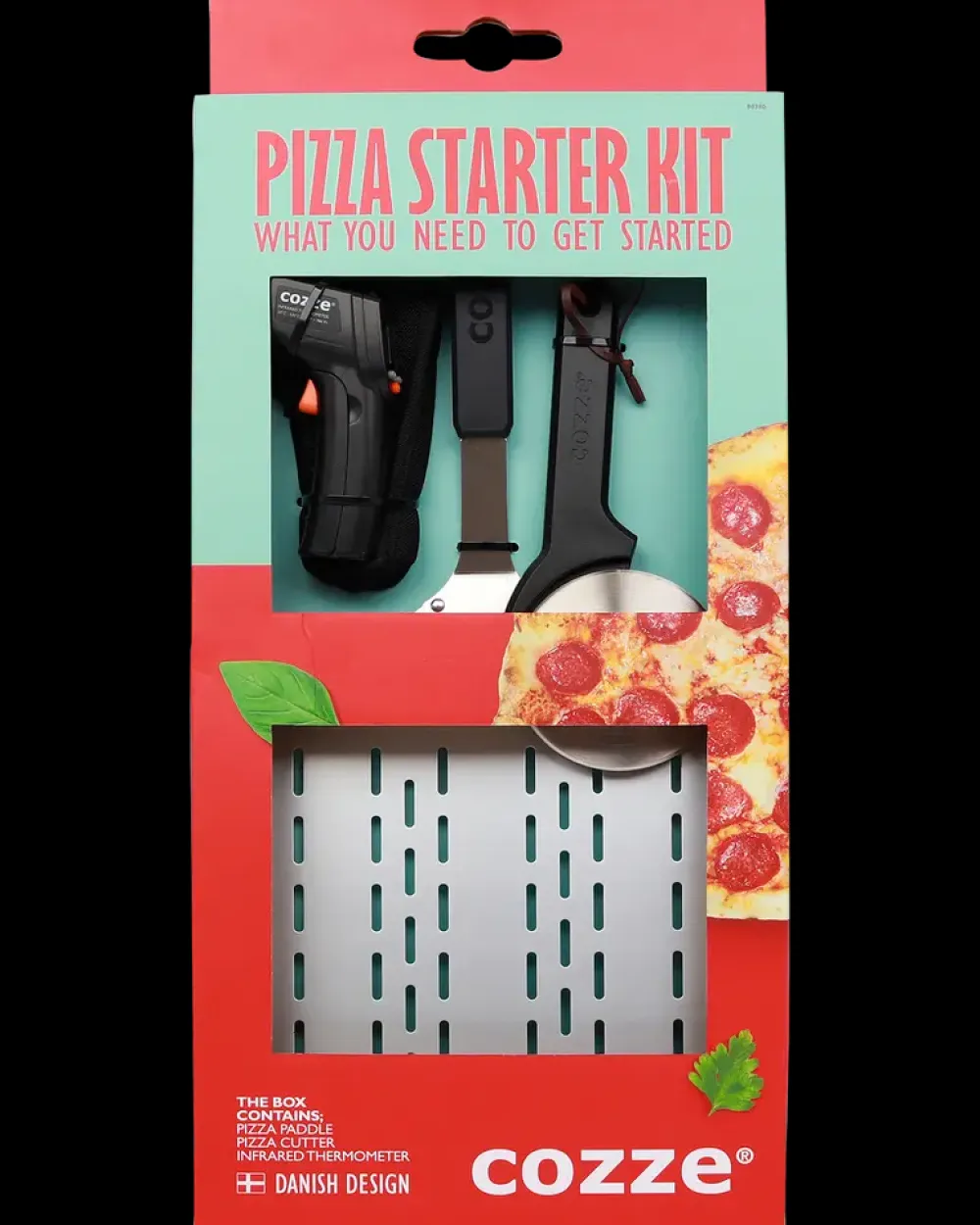 Cozze gavesæt samler tre centrale redskaber til tilberedning af pizza derhjemme. Sættet består af en pizzaspade, et infrarødt termometer og en pizzaskærer, som tilsammen dækker både håndtering, temperaturkontrol og udskæring af pizza.Pizzaspaden anvendes til at lægge pizzaen i ovnen og tage den ud igen. Spadehovedet er udført i aluminium og har perforeringer, der reducerer overskydende mel under bagning. Grebet kombinerer rustfrit stål og plast og giver et stabilt greb ved brug.Det infrarøde termometer bruges til kontaktløs måling af overfladetemperatur i pizzaovn eller på bagesten. Displayet er digitalt og viser temperaturen i enten Celsius eller Fahrenheit, hvilket gør det muligt at vurdere, hvornår ovnen er klar til bagning.Pizzaskæreren er udstyret med et rundt skærehjul i rustfrit stål, der skærer gennem pizzaen i én bevægelse. Håndtaget er fremstillet i plast og har læderstrop til ophæng.Tekniske detaljer:Pizzaspade: L. 60 cm. Spadehoved 28 x 28 cm. Pladetykkelse 1,25 mm. Vægt 0,580 kg.Termometer: Måleområde op til 530 °C. Nøjagtighed ±1,5 %. Bruger 2 x AAA-batterier (medfølger ikke).Pizzaskærer: Ø 110 mm. Skærehjul i 1,5 mm stål.