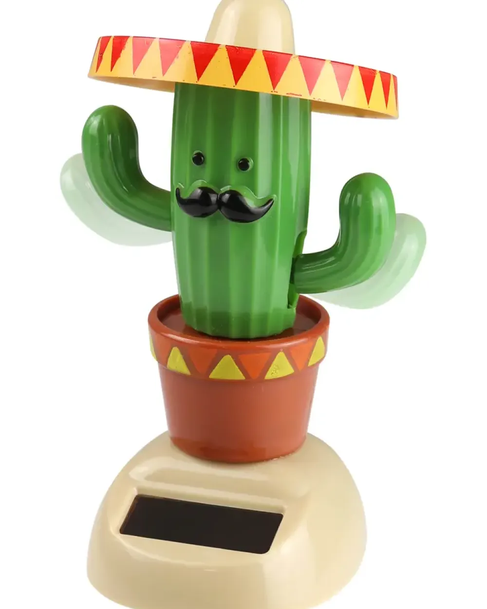 Disse sjove og dekorative figurer bringer liv til ethvert rum. De drives af en lille solcelle, der aktiverer bevægelsen, når figuren udsættes for lys. Vælg mellem tre assorterede designs: en farverig solsikke, en sombrero-klædt kaktus eller en solbrille-bærende flamingo.Mål:Solsikke: 7,5 x 7,5 x 11,5 cmKaktus: 5,9 x 6,5 x 11 cmFlamingo: 5,9 x 9,5 x 11,5 cmFigurerne er ideelle som sjov pynt til skrivebordet, vindueskarmen eller som en kreativ gaveidé. Den soldrevne funktion gør dem både miljøvenlige og underholdende.Variant kan ikke vælges ved køb i webshoppen.