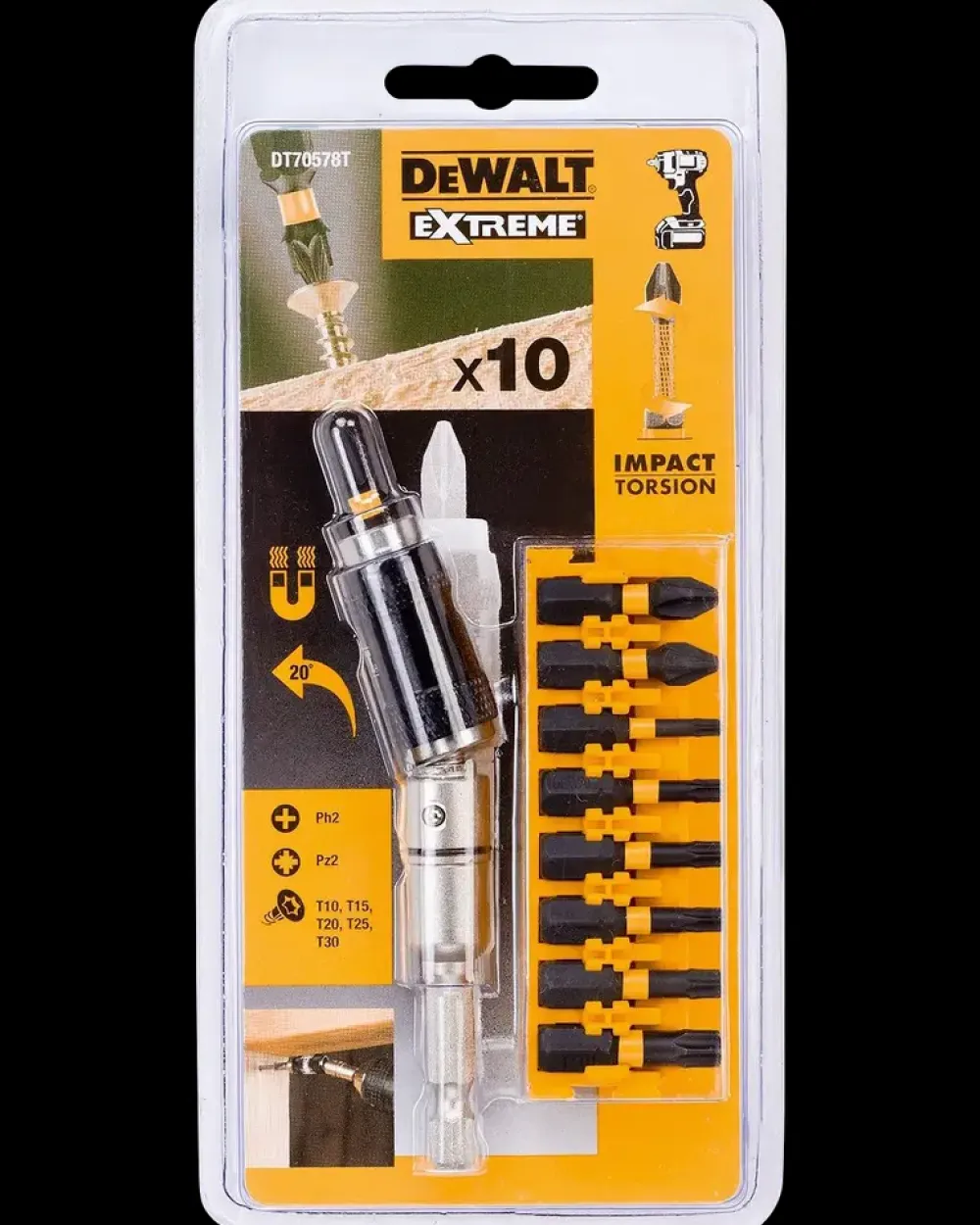 Smart bitssæt med 10 dele fra Dewalt inkl. magnetisk bitsholder med vippelig spids 20° til skrueopgaver på trange områder.Justerbar krave så bitsholderen kan anvendes i vippet udgave eller som almindelig magnetisk bitsholder.Sættet består af:1 stk. vippelig magnetisk bitsholder.9 stk. 25 mm bits:PH: 2 x PH2.PZ: 1 x PZ2.TX: 1 x T10, 1 x T15, 2 x T20, 1 x T25, 1 x T30.