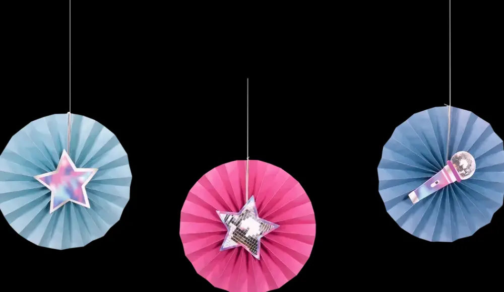 Skab en festlig atmosfære med vores flotte disco-vifter. Sættet indeholder tre farverige vifter med en diameter på 25 cm, perfekte til ophæng i loftet. Hver vifte har et unikt design, der tilføjer farve og liv til din fest. De er nemme at montere og kan genbruges.