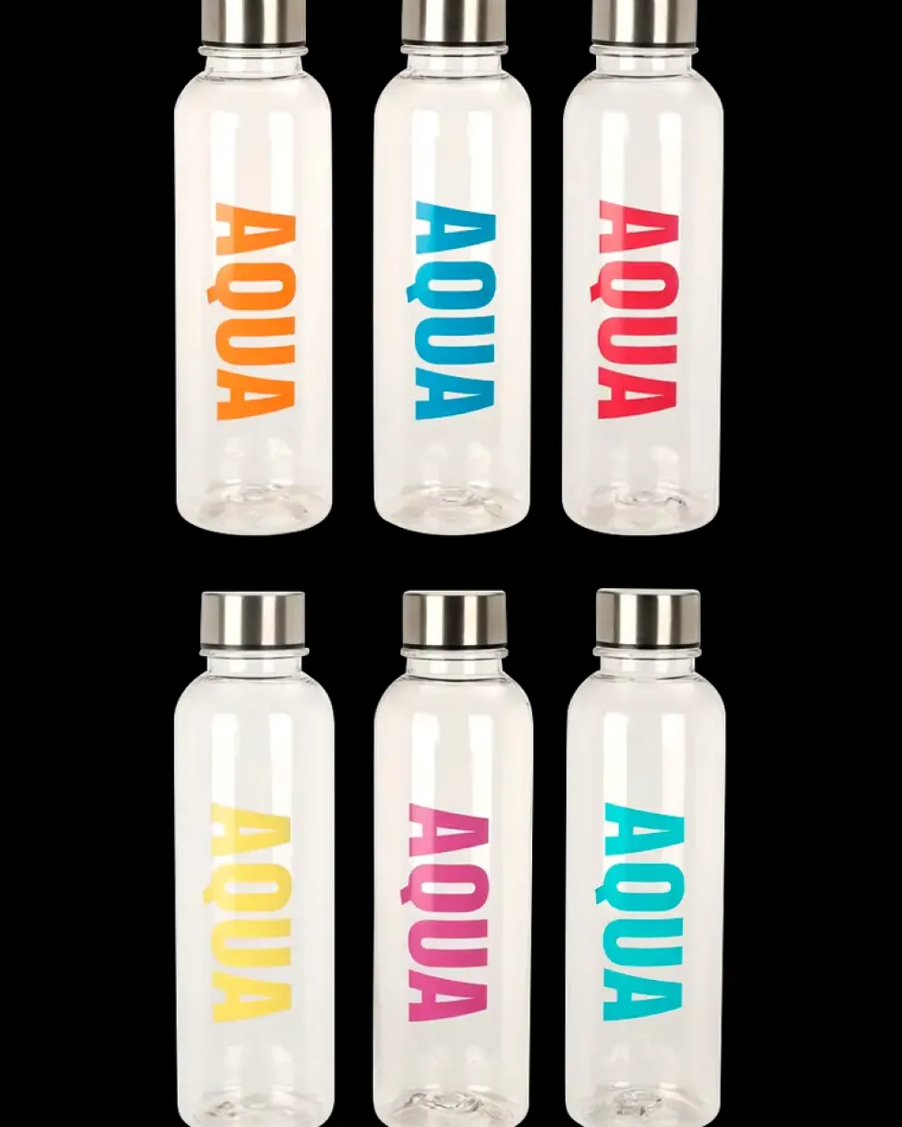 Praktisk drikkeflaske med en kapacitet på 500 ml, fremstillet i holdbart SAN-materiale. Designet er let og funktionelt med et metallåg, der har sort PP-indlæg for en tæt lukning. Flasken er dekoreret med teksten “AQUA”. Fås i farverne: grøn, gul, rød, mørkeblå, lyseblå, orange og pink.Farve kan ikke vælges ved køb i webshoppen.