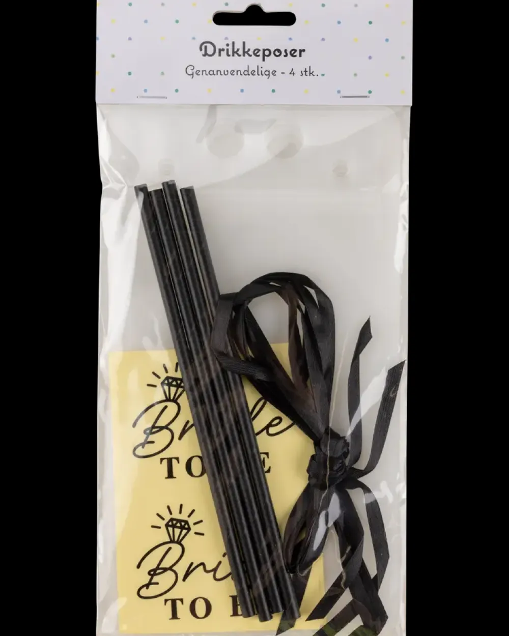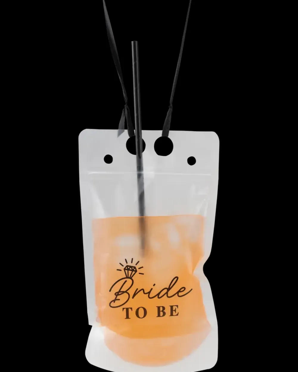 Drikkepose med sugerør og strop, teksten “Bride TO BE”.Tåler væske mellem 0-60 °C.