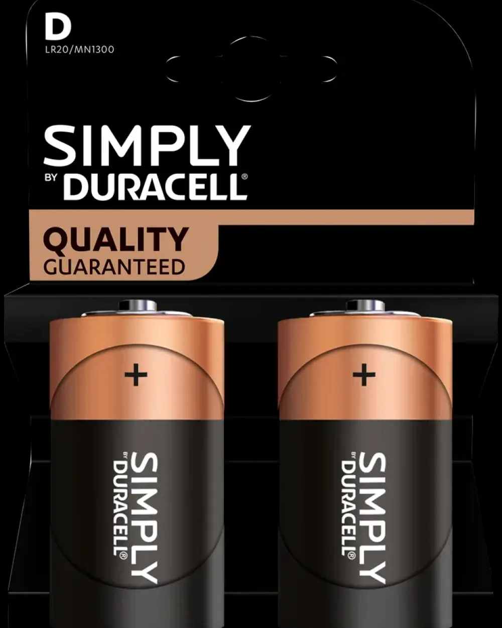 Duracell Simply alkaline D batterier – kvalitet garanteret til en mere overkommelig pris. Duracell Simply batterier tilbyder pålidelighed til en pris, der er overkommelig. De er gode til mange af de enheder, du bruger dagligt i dit hjem.Kan bruges til alle apparater der bruger D batterier.Det anbefales at du fjerner batterierne fra apparatet, hvis det ikke skal bruges i længere tid.Opbevar altid dine batterier ved stuetemperatur for at forlænge levetiden.Husk at bortskaffe dine batterier korrekt. Læs mere på din kommunes hjemmeside. Smid aldrig batterier i skraldespanden.