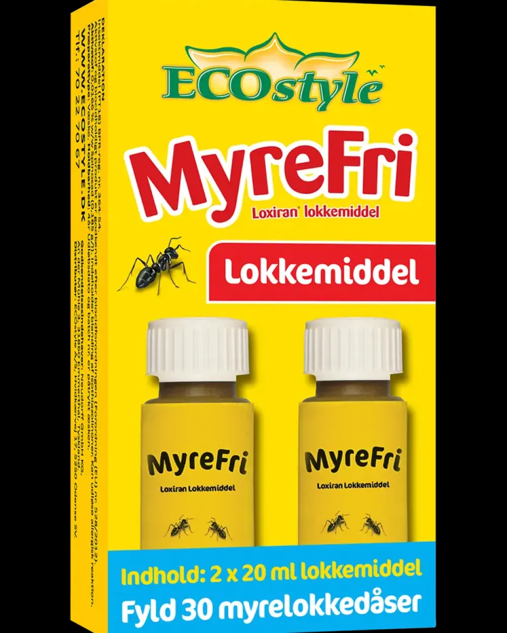 ECOstyle MyreFri Lokkemiddel er genopfyldning til MyreFri Genopfyldelige Lokkedåser. De 2 x 20 ml lokkemiddel er nok til at fylde 30 myrelokkedåser. Giver en pris på kun 5 kr pr. dåse ved vejledende udsalgspris. Indhold: 2 x 20 ml.