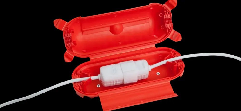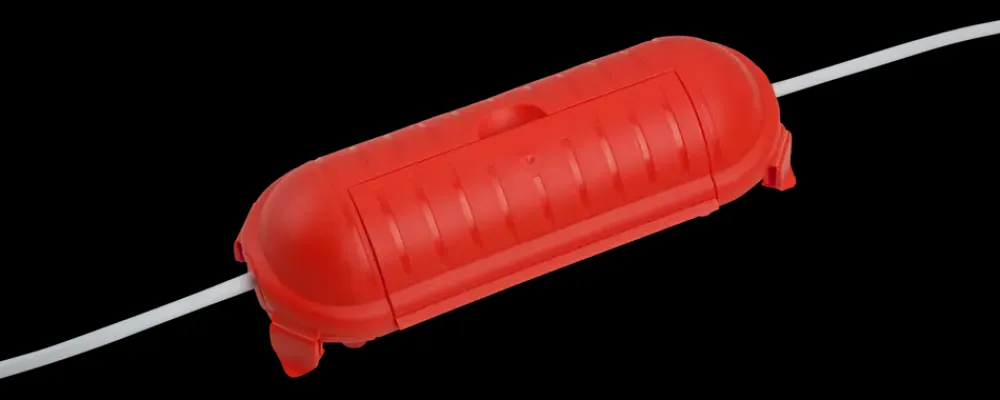 El-kappe til udendørs brug, der beskytter elektriske samlinger mod fugt og snavs. Velegnet til midlertidige installationer som forlængerledninger og stikforbindelser. Kan ophænges og bruges ved byggeri, havearbejde og midlertidig strømføring.Fremstillet af slagfast plast med integreret gummitætning (TPE) og låsemekanisme, som holder samlingen tæt og stabil. Passer til kabler med yderdiameter 6,5–9,0 mm. IP44-klassificeret – beskytter mod vandstænk og partikler >1 mm.Synlig rød farve med sort tætningsgummi og ophængsøjer i begge ender. Mål: ca. 80 x 130 mm. IP44-mærkning præget på produktet.