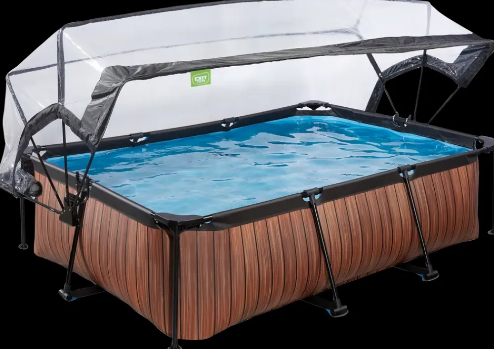 EXIT Wood poolen på 220 x 150 x 65 cm er en rektangulær fritstående pool med poolskærm. Denne kompakte pool indeholder en filterpumpe og skiller sig ud med sit flotte træmønster.Indersiden af poolen er blå, så den stadig har den forfriskende poolfølelse. Det pulverlakerede stålstel og de robuste hjørner på EXIT Wood poolen sikrer, at poolen altid forbliver stabil og holder i årevis.Den medfølgende pumpe frisker vandet op, og holder det i bevægelse.Med EXIT poolskærmen til pools er du ikke længere afhængig af vejrudsigten. Poolskærmen holder snavs ude af vandet og fungerer også som en bæredygtig løsning til opvarmning af vandet, da solens varme holdes under poolskærmen. Poolskærmen er let at åbne takket være sin unikke hængselmekanisme, og da den er gennemsigtig, kan du stadig holde øje med, hvad der foregår uden for poolen.Kort sagt: nyd din pool uanset vejret.Medfølger: Patronfilterpumpe, filtermateriale og poolskærm.Mål: B. 150 x L. 220 cm.Pooldybde: 65 cm.Ydermål: B. 210 x L. 273 x H. 135 cm.Svømmeområde: 220 x 150 x 55 cm.Patronfilterpumpe: 12V, 20 W, IPX5, slange Ø32 mm.Filterkapacitet: 300 gal / t (1136 liter)Leveres i 2 kasser: 111 x 32.5 x 24.5 cm (18 kg) og 96 x 30 x 13 cm (15,9 kg).