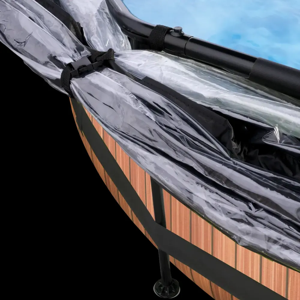 EXIT Wood poolen med Ø244 x 76 cm er en rund fritstående pool med poolskærm. Den kompakte pool indeholder en filterpumpe og skiller sig ud med sit flotte træmønster.Indersiden af poolen er blå, så den stadig har den forfriskende poolfølelse.Det pulverlakerede stålstel og de robuste hjørner på EXIT Wood poolen sikrer, at poolen altid forbliver stabil og holder i årevis.Den medfølgende pumpe frisker vandet op, og holder det i bevægelse.Med EXIT poolskærmen til pools er du ikke længere afhængig af vejrudsigten. Poolskærmen holder snavs ude af vandet og fungerer også som en bæredygtig løsning til opvarmning af vandet, da solens varme holdes under poolskærmen. Poolskærmen er let at åbne takket være sin unikke hængselmekanisme, og da den er gennemsigtig, kan du stadig holde øje med, hvad der foregår uden for poolen.Kort sagt: nyd din pool uanset vejret.Medfølger: Patronfilterpumpe, filtermateriale og poolskærm.Mål: Ø244 cm.Pooldybde: 76 cm.Ydermål: Ø264 cm.Svømmeområde: Ø224 x 70 cm.Patronfilterpumpe: 12V, 20 W, IPX5, slange Ø32 mm.Filterkapacitet: 300 gal / t (1136 liter)Leveres i 2 kasser: 104 x 30 x 12 cm (11,65 kg) og 111 x 33 x 26 cm (17,7 kg).