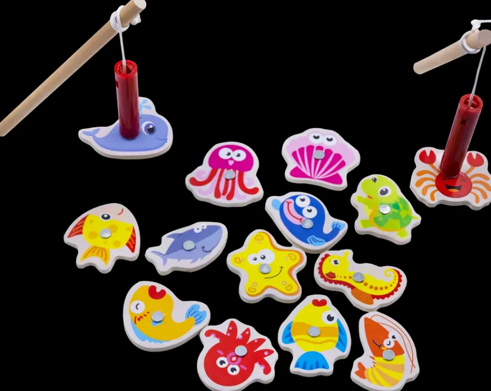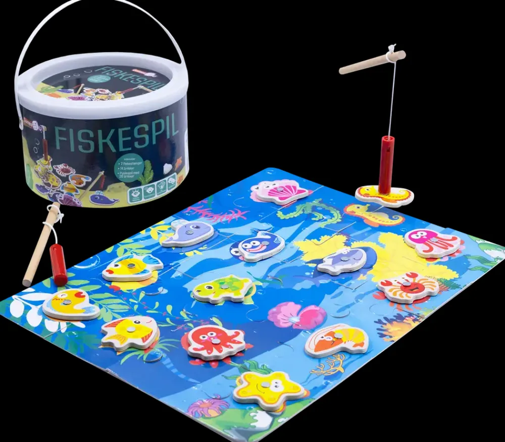 Fiskespil, der stimulerer finmotorik, hånd-øje-koordination og kreativ tænkning hos mindre børn. Sættet indeholder 2 fiskestænger, 14 farverige fiskebrikker og et puslespil med 20 brikker, som tilsammen danner en undervandsverden som spilleplade. Magnet i både fisk og stænger gør det nemt at “fange” de forskellige havdyr.Fiskene er lavet i robust, farverigt træ med tydelige detaljer og glade ansigter, som gør dem lette at genkende. Leveres i en praktisk plastspand med hank – nem at opbevare og tage med. Egnet til både selvstændig leg og leg med andre børn.
